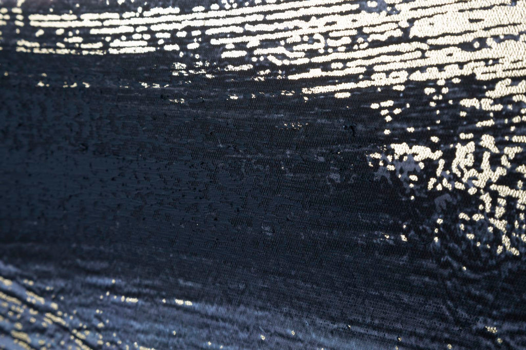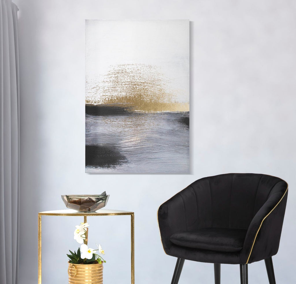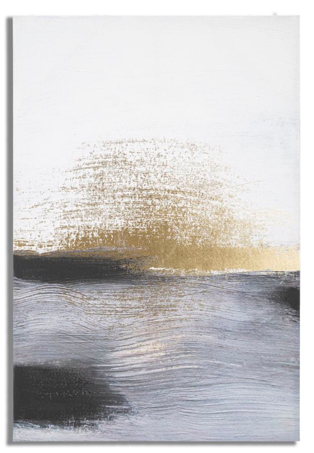 Questa stampa su tela con telaio in legno presenta un affascinante design astratto che richiama l'immensità del mare. Lo stile vagamente impressionista, caratterizzato da pennellate delicate, crea un'atmosfera di incanto. Gli accenti dorati sporadici aggiungono una sensazione di mistero e magia, donando a questa opera un tocco di eleganza e raffinatezza.
