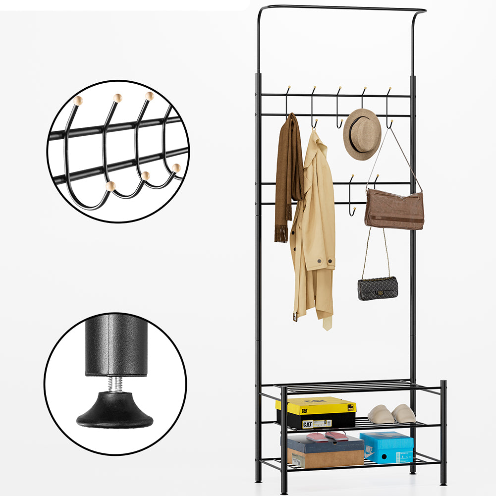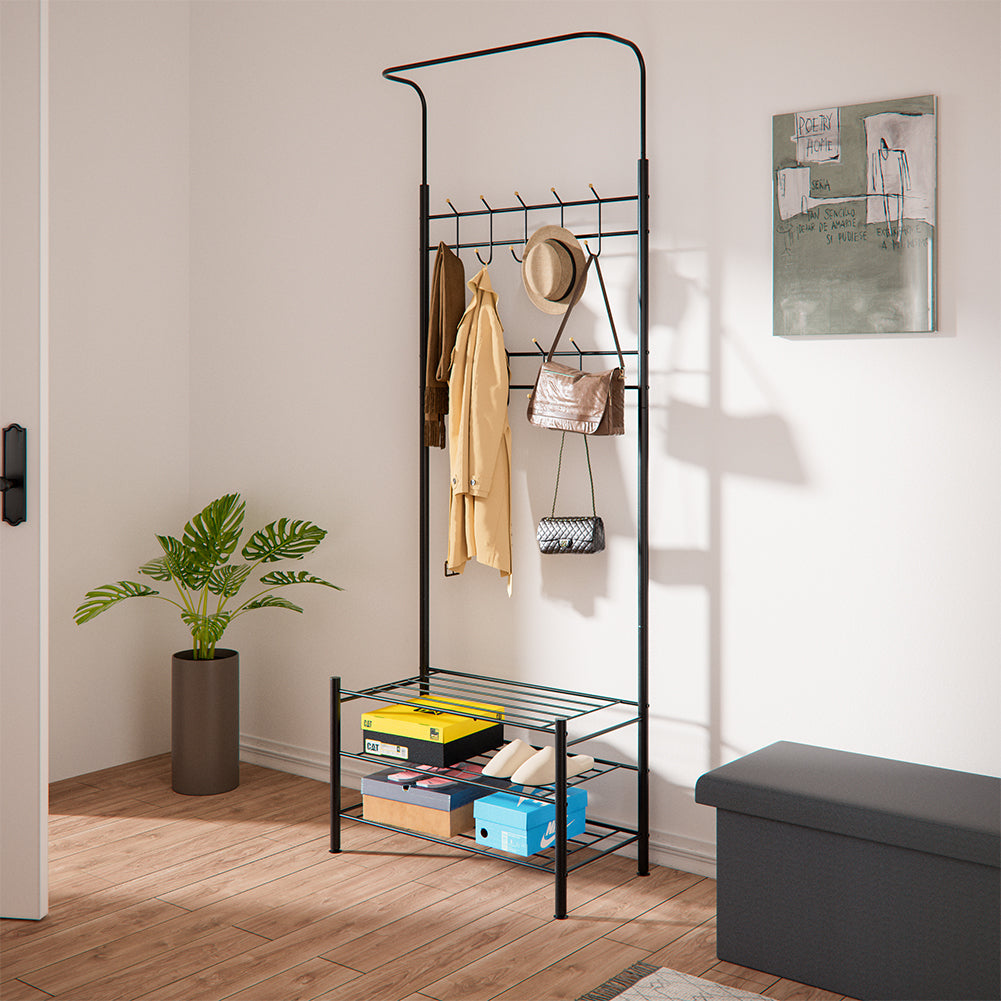 Stand Appendiabiti da Ingresso 9 Ganci con Scarpiera a 3 Ripiani in Metallo Nero
