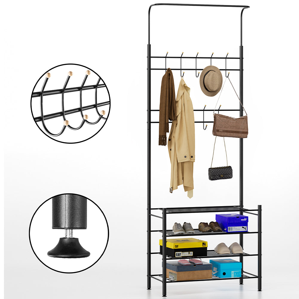 Stand Appendiabiti da Ingresso 9 Ganci con Scarpiera a 4 Ripiani in Metallo Nero