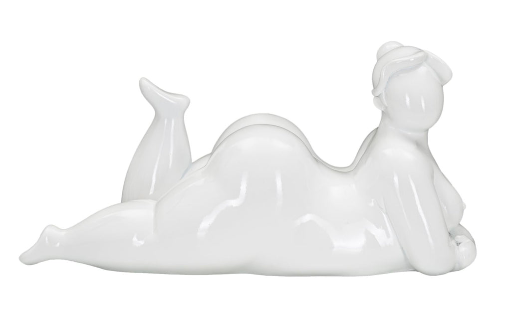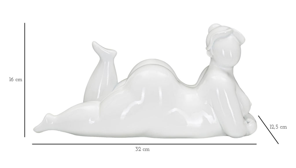 La statua bianca è un'opera elegante e sofisticata che ritrae una donna in una posa di rilassamento sdraiata. La sua figura trasmite una sensazione di serenità e tranquillità, con linee fluide e armoniose. La mancanza di dettagli e la semplicità del colore bianco conferiscono un tocco di raffinatezza e purezza all'opera, che cattura lo sguardo e incanta gli spettatori.