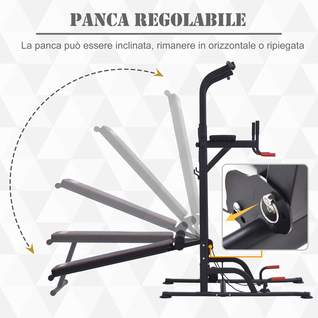 Machen Sie mit dieser multifunktionalen Fitnessstation der Marke ein komplettes Training zu Hause. Dieses Heim-Fitnessstudio umfasst eine Sit-Up-Bank, eine Klimmzug- und Push-Up-Klimmzugstange mit Rückenlehne und Widerstandsbänder. Die Klimmzugstange kann in der Höhe an Ihre Bedürfnisse angepasst werden. Ob Einsteiger oder Experte, diese Multifunktionsbank ist die ideale Wahl, um sich gleich zu Hause fit zu halten.