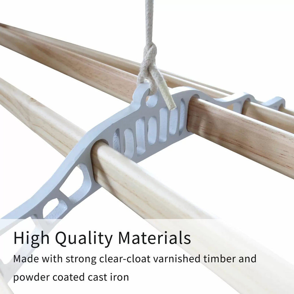 Creati specificamente per essere durevoli nel tempo e robusti, le 6 stecche in legno di pino ti permettono di appendere una vasta quantità di biancheria. La struttura con rivestimento trasparente ha un look attraente e tradizionale al tempo stesso e si posiziona facilmente tra i due supporti in ghisa e le carrucole.
