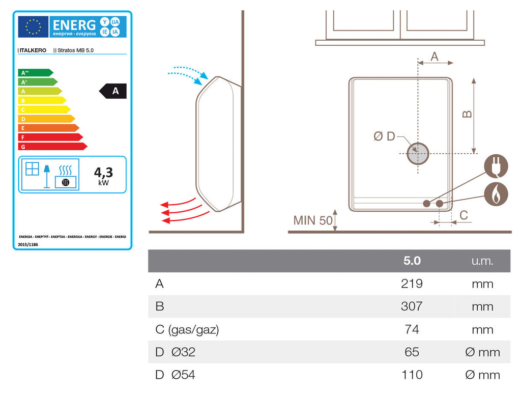 Stufa a gas moderna, elegante e innovativa, grazie all'uscita aria calda dall'alto garantisce una continua ed uniforme distribuzione del calore evitandone la stratificazione.