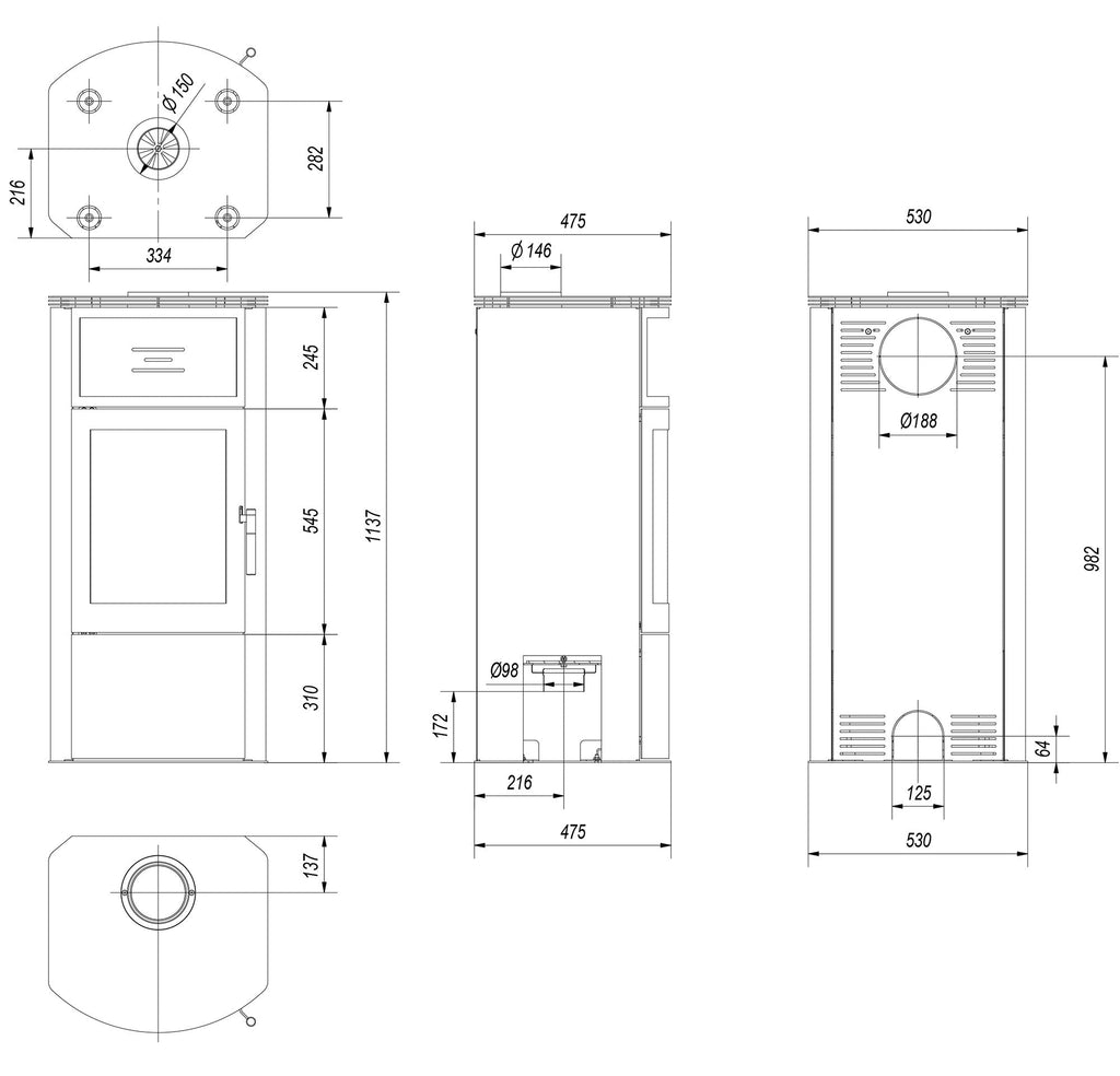 Unter dem Schornstein befindet sich eine zusätzliche verschließbare Kammer, in der das Außenlufteinlasssystem verborgen ist. Der verbleibende Platz kann beispielsweise genutzt werden, um eine bestimmte Menge Holz zu lagern. Die Türöffnung basiert auf einem Klick-Klack-System, das keinen zusätzlichen Griff benötigt. Dadurch wird die gesamte Einheit zu einem zusammenhängenden Körper.