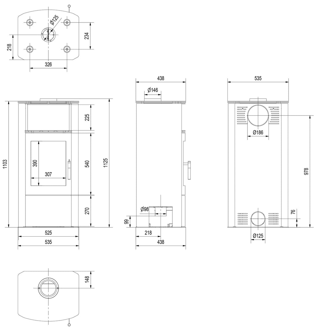 In diesem Einsatz befindet sich ein dreifaches Brennkammer-Luftsystem. Die Primärluft, die das Anzünden eines Feuers ermöglicht, wird unter dem Rost zugeführt. Sekundärluft - für eine sparsame und umweltfreundliche Verbrennung sorgen Belüftungsöffnungen in der Rückwand.