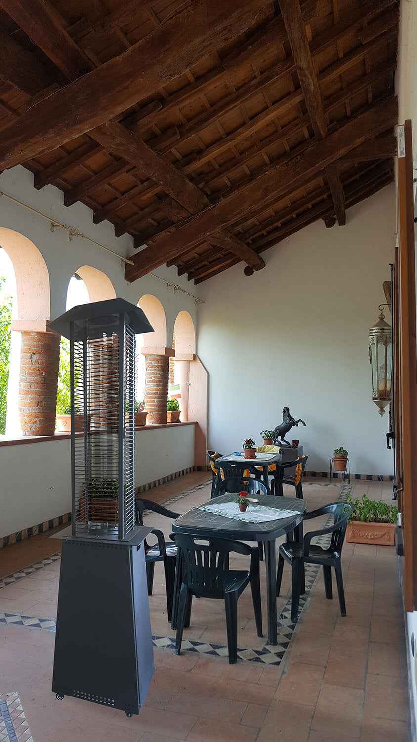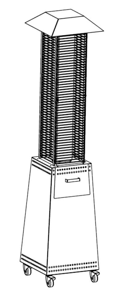 Pilz aus lackiertem Stahl. Ein großes und langes Keramikglas (Durchmesser 16 cm) beherbergt die über 70 cm hohe Flamme. Das Gitter kann geöffnet werden, um das Glasrohr zu reinigen, nachdem es vorsichtig entfernt wurde.