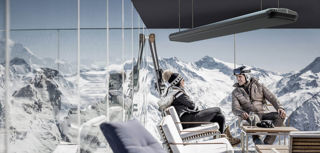 HOT-TOP schafft sowohl im Freien als auch in großen Räumen einen warmen Wohlfühlbereich für Menschen, ohne die Luft und Umgebung erwärmen zu müssen. Entwickelt zusammen mit der Enzo Ferrari Universität Modena. IP55 Für den Innen- und Außenbereich geeignet.