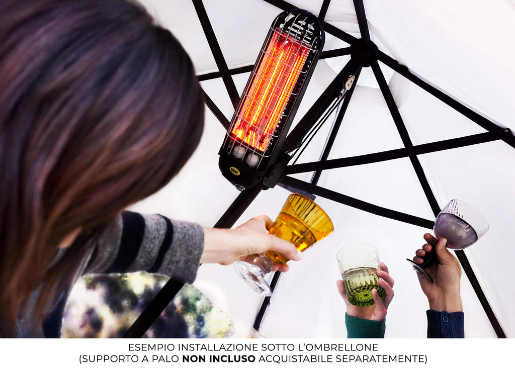 Lucciola ist eine einzigartige, kompakte, leichte und vielseitige Infrarotheizung . Lucciola ist die einzige Leuchte, die für die Installation direkt unter Sonnenschirmen oder Masten (Stütze NICHT INBEGRIFFEN) und an der Wand (Stütze inbegriffen) konzipiert ist.