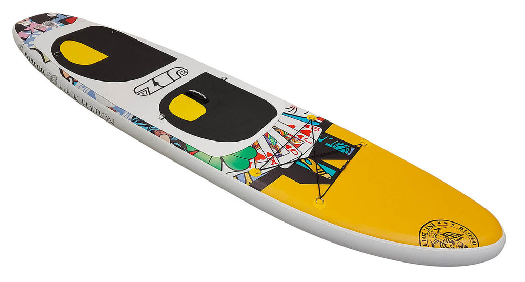 D13EGO, artista italiano con base a Londra, famoso per i suoi lavori artistici che uniscono il mondo della finanza a quello dei fumetti, è il creatore del design esclusivo del SUP a lui dedicato. La D13EGO Special Edition o "Luck Edition" per i numerosi riferimenti alla fortuna presenti su di essa, è una tavola solida, stabile e utilizzabile per i piu disparati utilizzi acquatici. Tra gli accessori inclusi è presente anche la pagaia con manico in fibra di carbonio comune a tutte le tavole della linea "Artistica" di JBAY.ZONE.