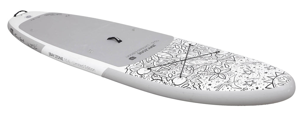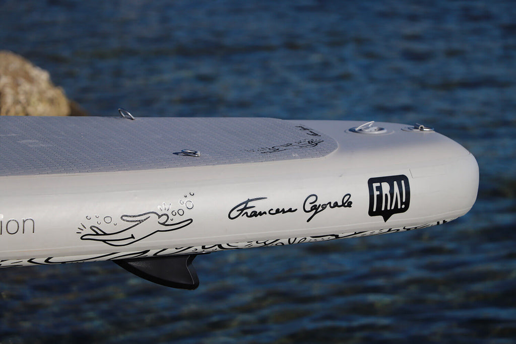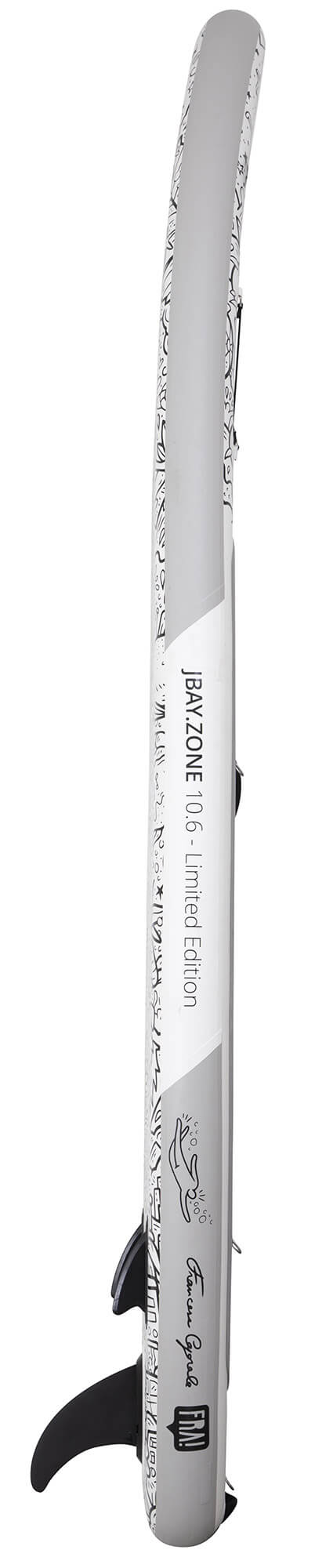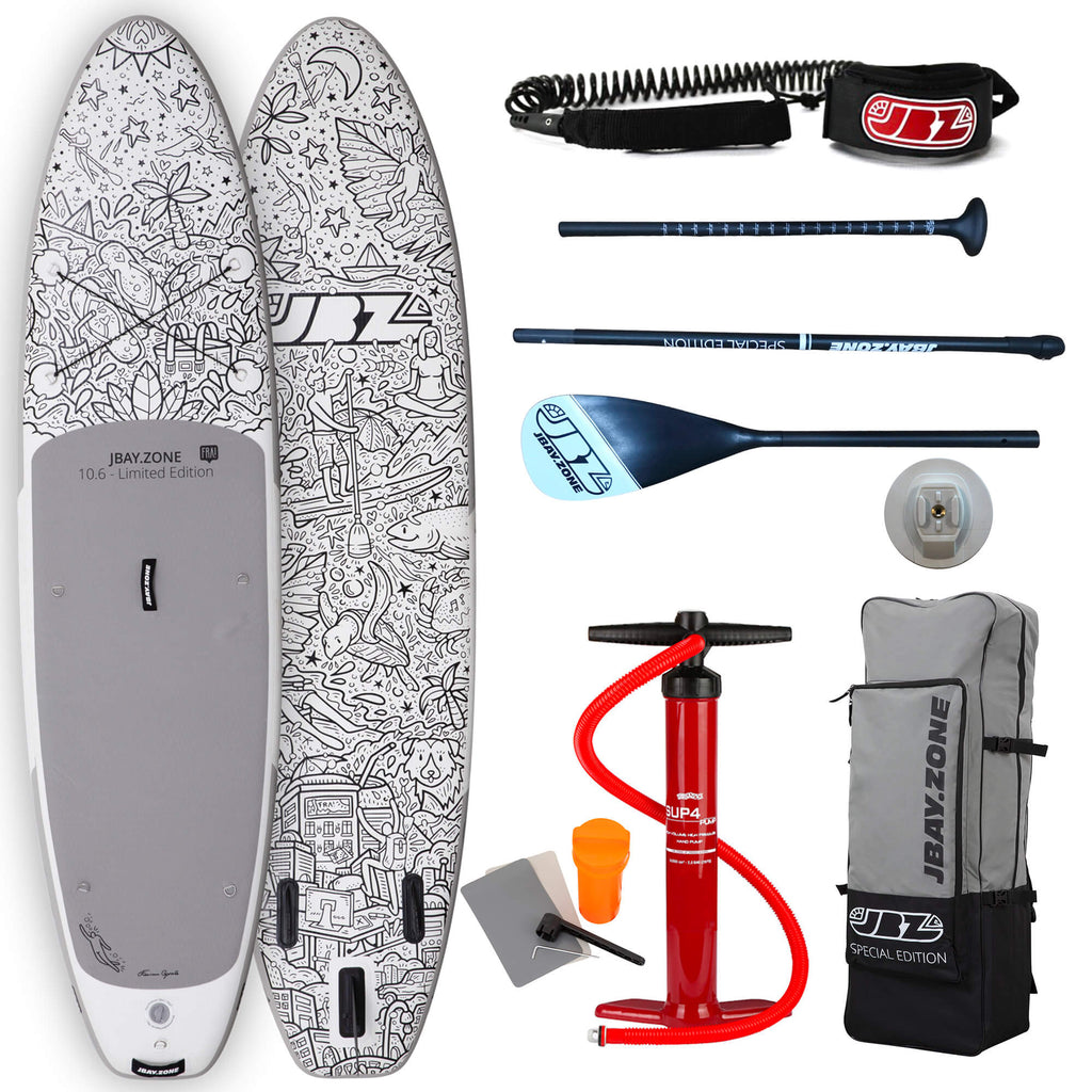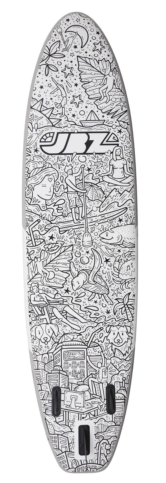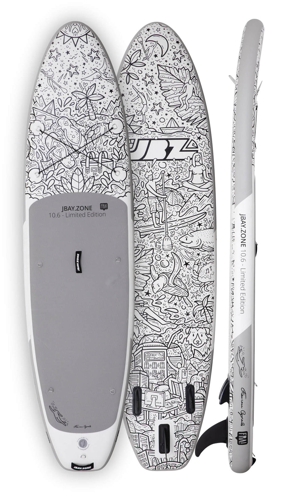 Grazie alla partnership con FRA!, doodle artist di fama internazionale, il SUP in Edizione Limitata JBAY.ZONE presenta un design assolutamente unico. Una storia di sport ed evasione dal quotidiano viene raccontata dall'abile mano di FRA! sfruttando il SUP come tela, dando vita ad una tavola straordinaria. Il SUP FRA! Misura 320x81cm, è versatile e utilizzabile per diversi tipi di escursione acquatica e allenamenti e comprende un set di accessori completo di tutto il necessario. La pagaia inclusa, invece dello shaft standard in alluminio, presenta un manico in fibra di carbonio.