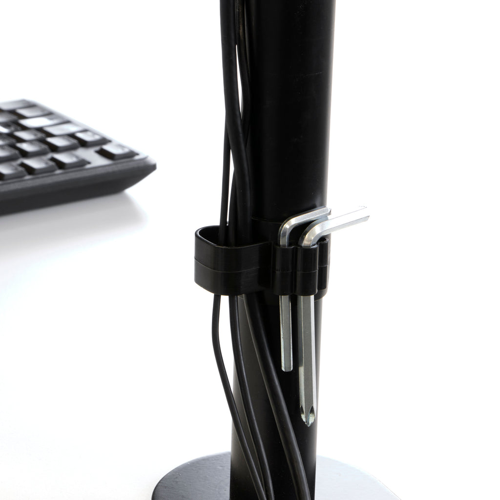 - Zwei ausziehbare Monitorarme mit einer maximalen Länge von 430 mm. Enthält Kabelverschraubungen, um die Verkabelung organisiert und außer Sichtweite zu halten.
