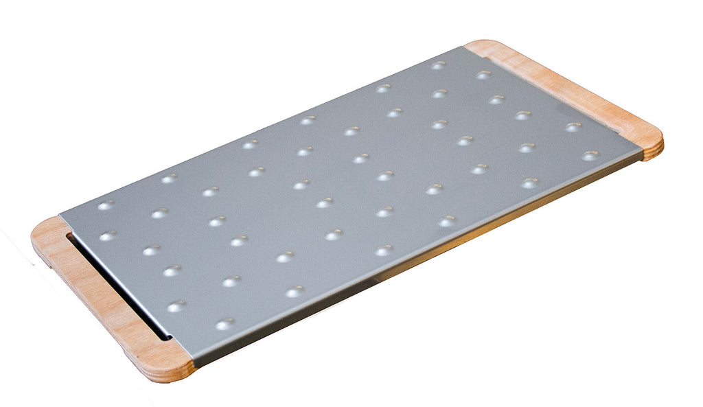 Tagliere "Giusto" per servire pizze e focacce. Supporto in legno e superficie in acciaio inox bugnata removibile e lavabile in lavastoviglie.