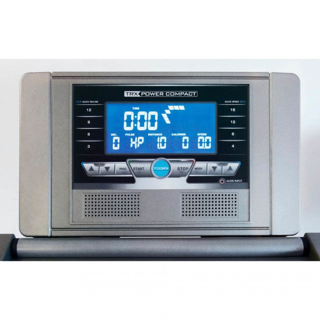Die Konsole ist einfach und intuitiv, angereichert durch ein blau hinterleuchtetes LCD-Display , es zeigt Trainingsdaten wie: Geschwindigkeit – Herzfrequenz – Distanz – Zeit – Steigung – Kalorienverbrauch – Runde 400 Meter – Laufprogramm, Geschwindigkeit und Steigung können auch gesteigert werden mit den Auswahltasten auf der Konsole oder am Handlauf.