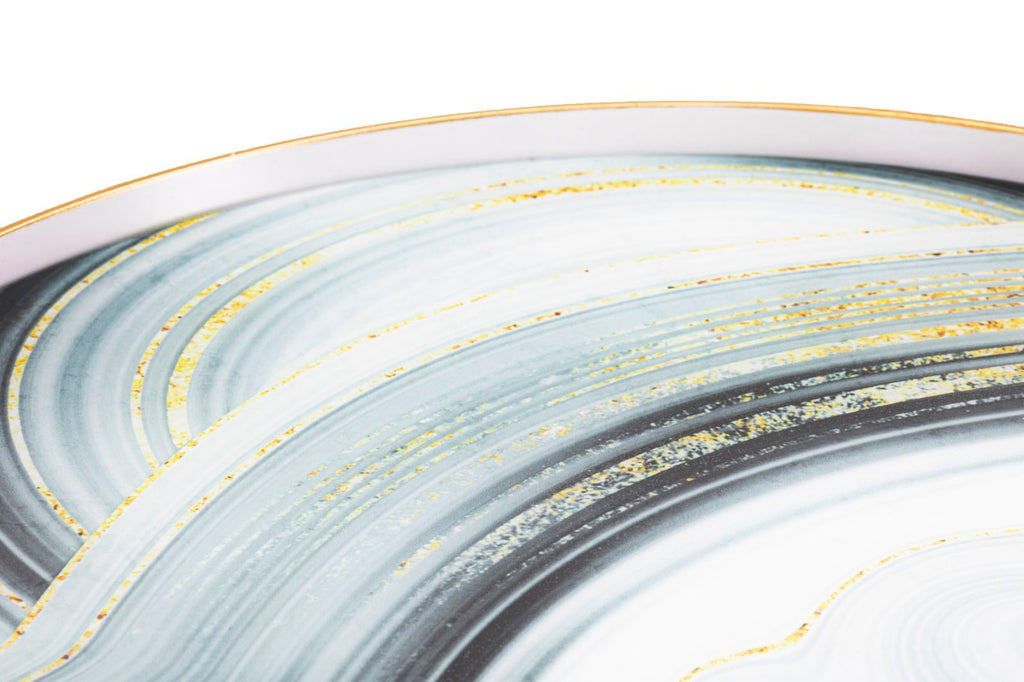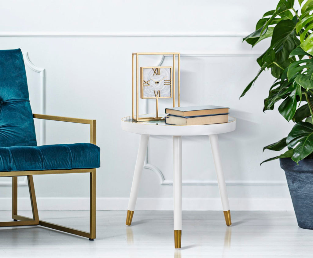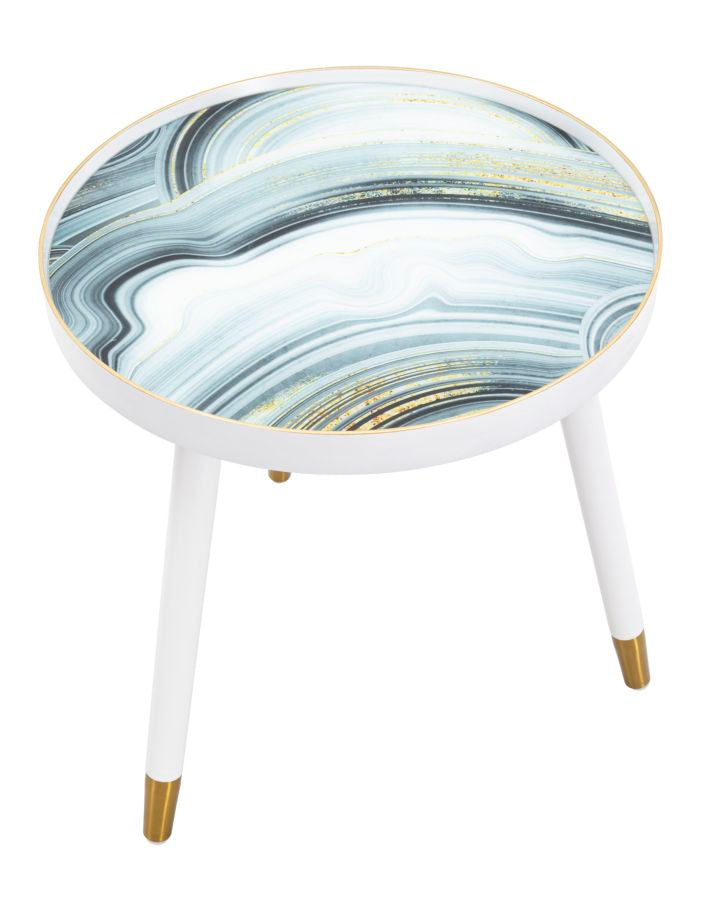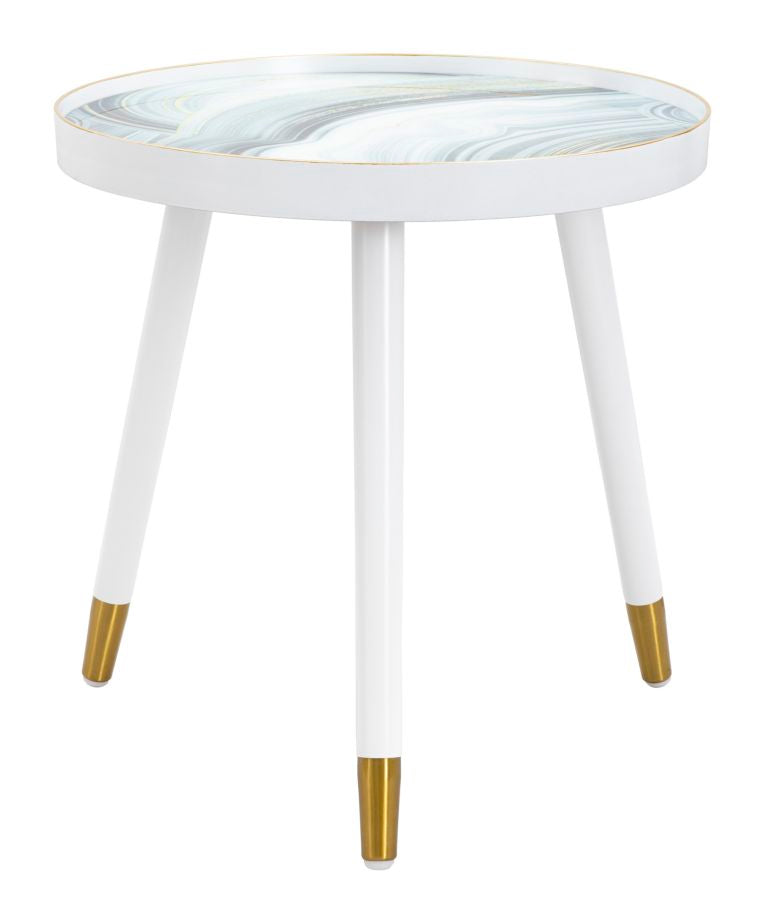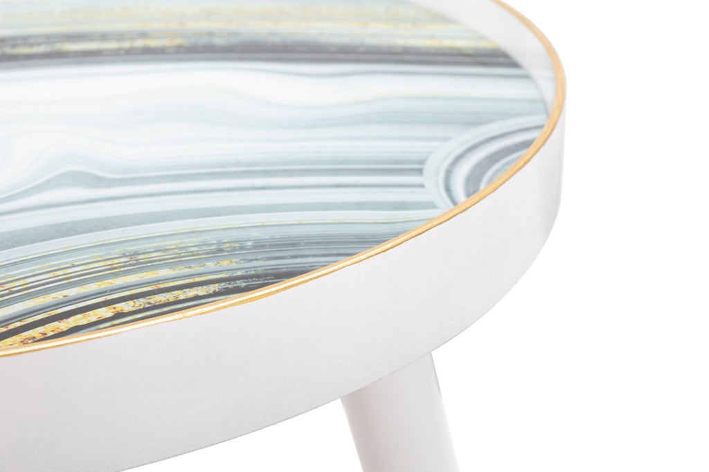 Runder Couchtisch mit weißer Struktur und eleganten goldenen Oberflächen an den Beinen. Die Platte besteht aus Glas mit einem marmorähnlichen Finish, das einen Hauch von Klasse und Raffinesse verleiht.