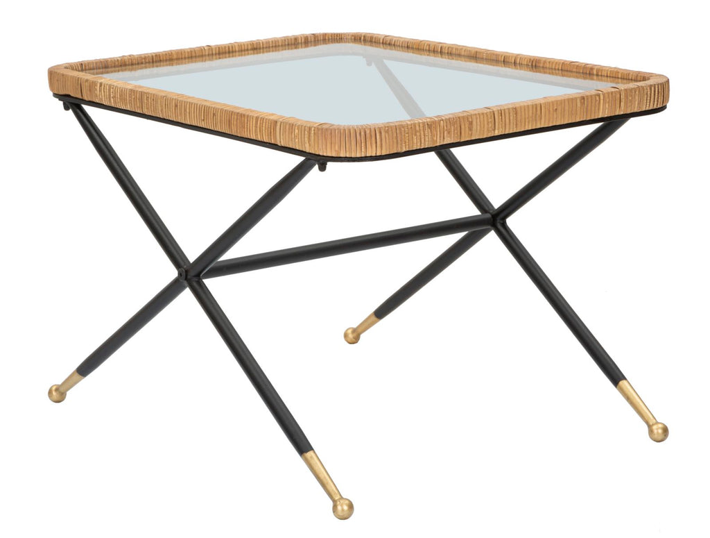 Rechteckiger Couchtisch mit schwarzem Metallrahmen und Glasplatte mit abgeschrägten Ecken, eingefasst in Rattangeflecht. Besonders ist das Finish der Beine mit dem goldenen unteren Teil. Das einfache, aber fesselnde Design macht es zu einer perfekten Ergänzung für jede Art von Möbel.