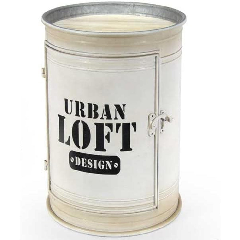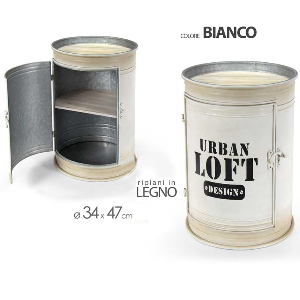 1 x Tavolino Contenitore Bidone Tondo Struttura in Metallo Bianco e Ripiani in Legno