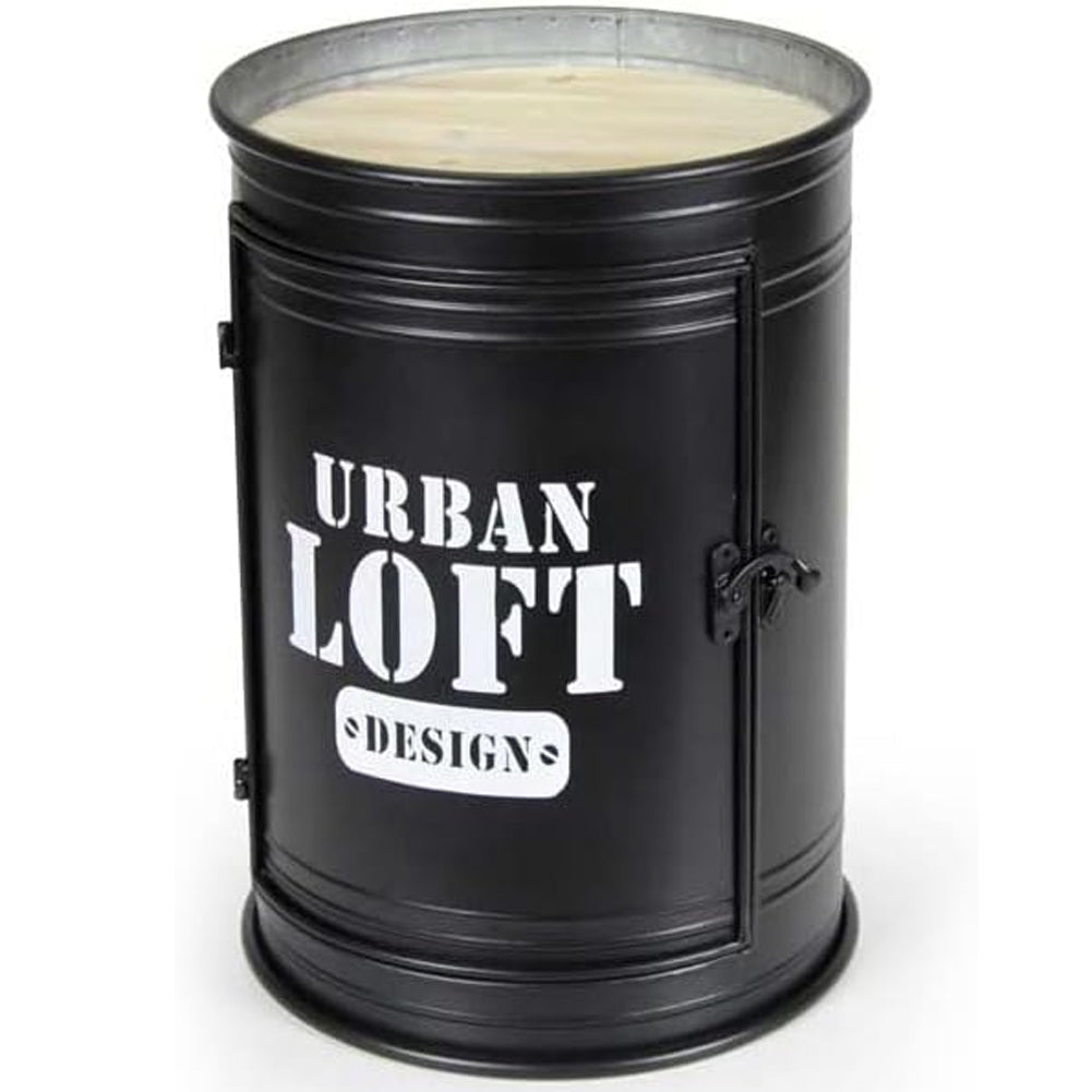 Tavolino Contenitore Bidone Tondo Struttura in Metallo Nero e Ripiani in Legno