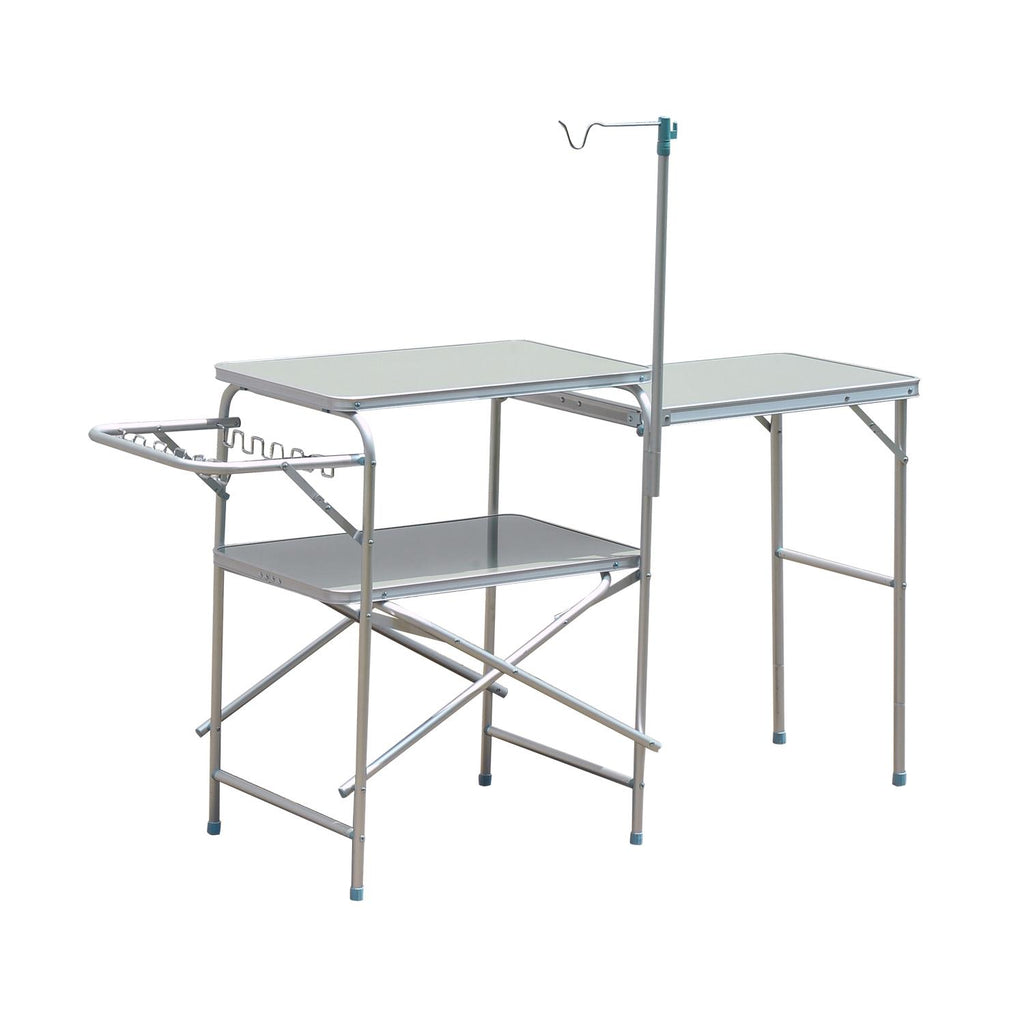 Dieser multifunktionale Campingtisch besteht aus zwei Ablagen, einem Campinglampenhaken, einer Ablage und einem Element zum Aufhängen diverser Utensilien.