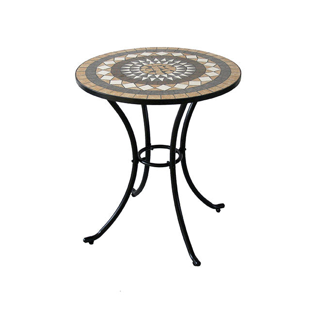 Runder Couchtisch, schwarz pulverbeschichtete Eisenstruktur (mattes Finish), Mosaikplatte mit Keramikfliesen d. cm 60 x h 70 Beinteil d. 22 x 0,8 mmRunder Garten-Couchtisch aus Eisen mit Mosaik-Keramikplatte von Taddei Musa