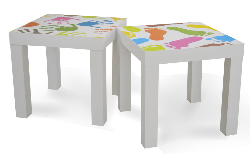 Couchtisch mit weiß lackierter Holzstruktur und verschiedenen Hand-/Fußdekorationen auf der Platte.