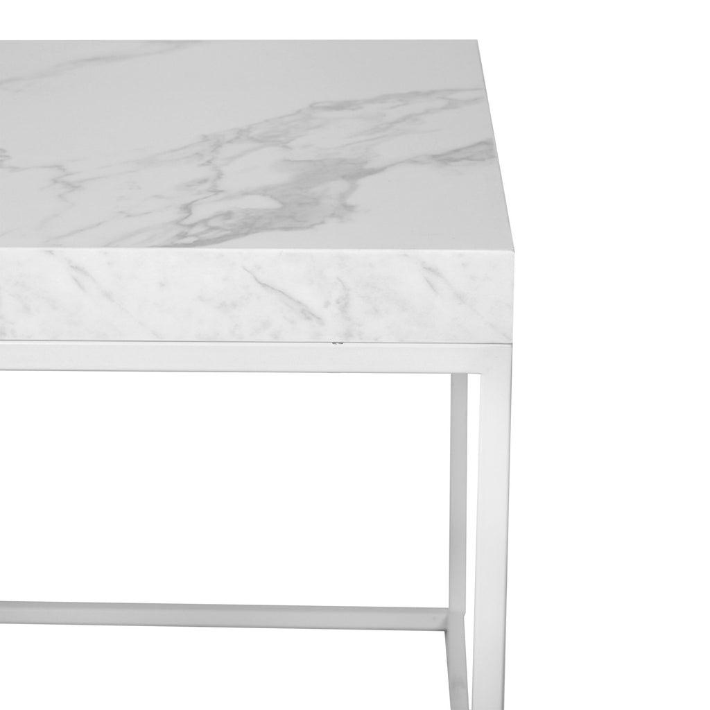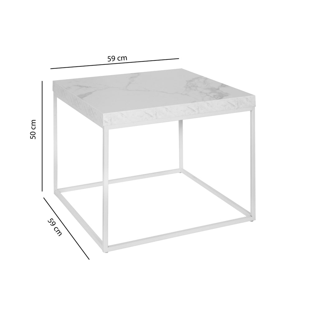Il tavolino squared presenta un design minimal e geometrico, il top in effetto marmo è sorretto da una struttura in metallo bianca, la sua forma ricorda quella del disegno di un cubo, la cui unica faccia coperta è appunto il piano in effetto marmo. Semplice, minimal e particolare al tempo stesso è ideale per living e soggiorni moderni.