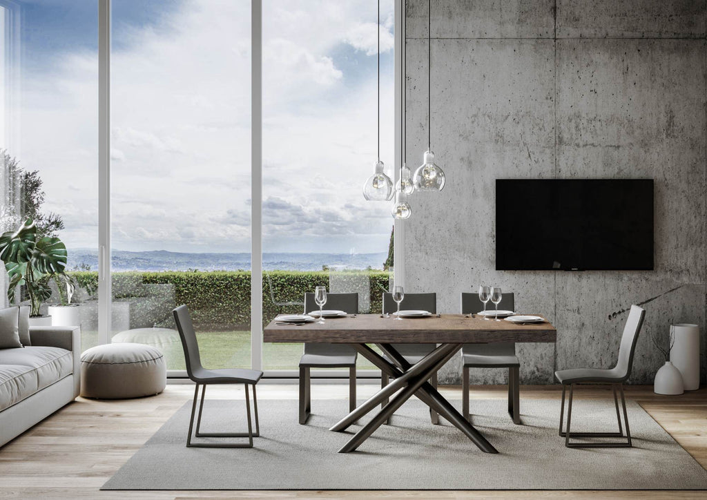 Tavolo da pranzo fisso 180x90 con gambe tubolari intrecciate tra loro a forma cilindrica. Piano in microparticelle di legno disponibile in vari colori con lavorazione a Folding con bordo h. 8 cm. Realizzata interamente in Italia mediante l'utilizzo di materiali 100% italiani.