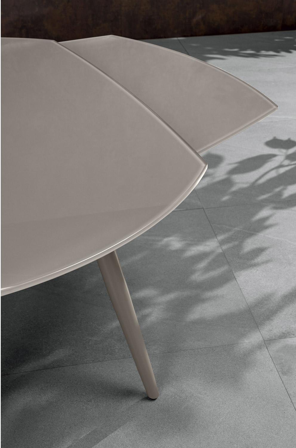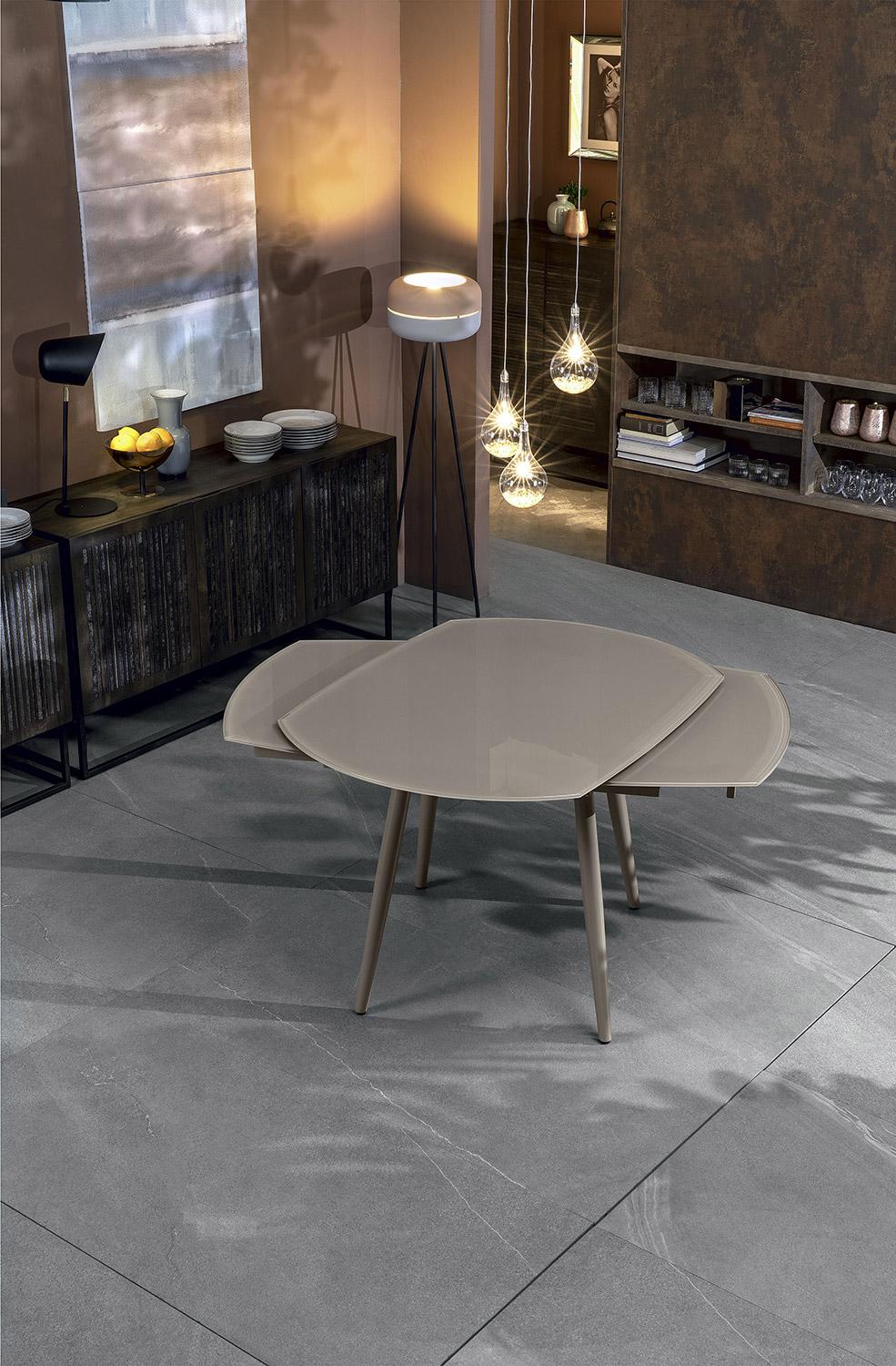 Ausziehbarer Tisch 120/180x90x76 cm aus Metall mit taubengrauer Glasplatte