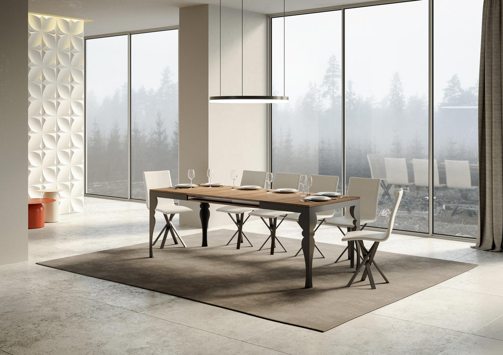 Il Tavolo Paxon Evolution 120 Allungabile fino a 380 cm è una linea dallo stile stravagante e raffinato, grazie alle particolari decorazioni delle gambe. Le gambe e il telaio sottopiano in ferro verniciato è in grado di garantire solidità alla struttura, anche quando completamente esteso. Si adatta ad ogni esigenza di spazio, grazie al particolare sistema di allunghe che gli permette di estendersi fino a 380 cm. Il Tavolo Paxon Evolution ha due allunghe alloggiate sotto il piano, pronte all'utilizzo, le altre tre sono da riporre in altro luogo quando non utilizzate. Made in Italy con materiali 100% italiani.