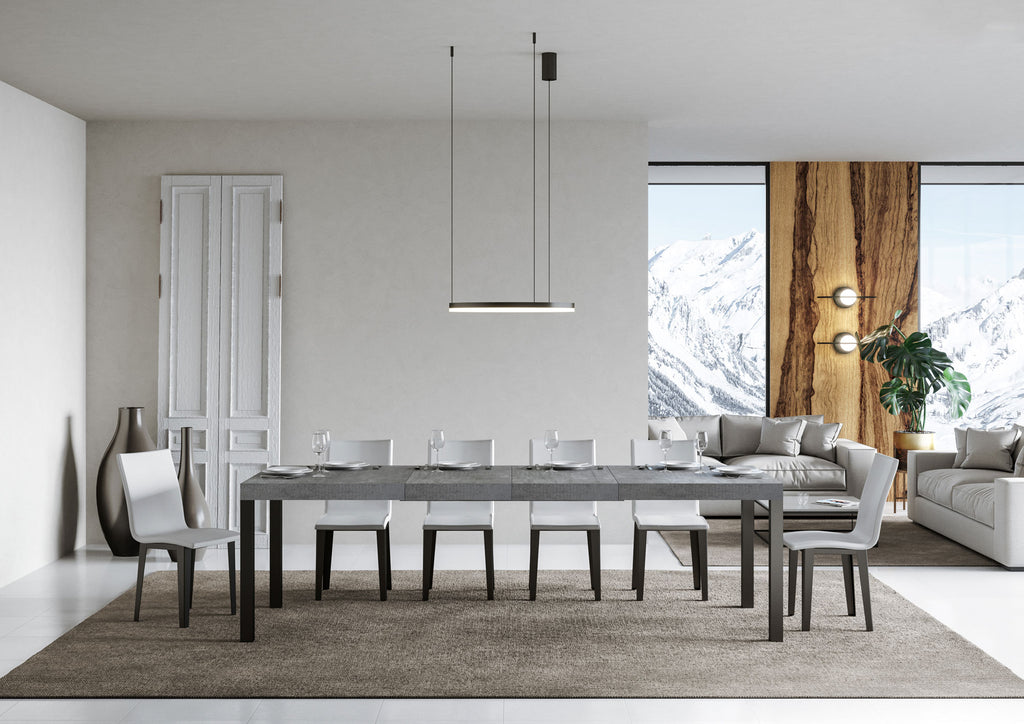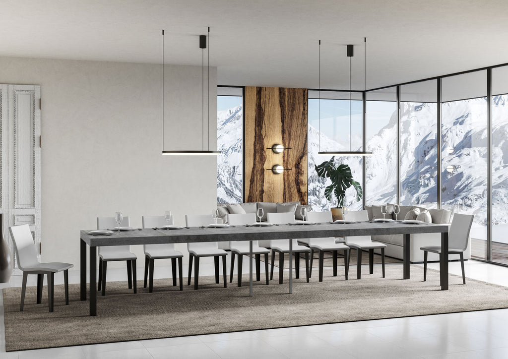 Tavolo allungabile Everyday Premium da 120 cm, dal design lineare, semplice ed essenziale, si adatta a qualsiasi stile di arredamento e si rivela la scelta ideale sia come tavolo da pranzo che come elemento d'arredo per il soggiorno, dove poter accogliere i propri ospiti con stile. Il tavolo allungabile Everyday Premium è in grado di estendersi progressivamente fino a 380 cm capace di ospitare 16 persone. Realizzato con pannelli in nobilitato, gambe in ferro, piano e allunghe con lavorazione a Folding. Il sistema di estensione con guide telescopiche in alluminio rende il tavolo stabile e robusto anche se totalmente allungato, senza bisogno di ulteriori sostegni. Quando non utilizzate, le allunghe non trovano collocamento all’interno della struttura del tavolo e vanno quindi riposte altrove.