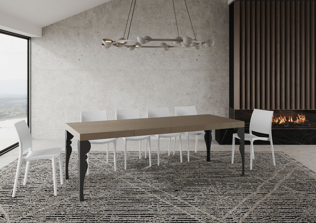 Tavolo allungabile Paxon Premium da 120 cm, dal design moderno dallo stile ricercato e stravagante, si adatta a qualsiasi stile di arredamento e si rivela la scelta ideale sia come tavolo da pranzo che come elemento d'arredo per il soggiorno, dove poter accogliere i propri ospiti con stile. Il tavolo allungabile Paxon Premium è in grado di estendersi progressivamente fino a 380 cm capace di ospitare 16 persone. Realizzato con pannelli in nobilitato, gambe in ferro, piano e allunghe con lavorazione a Folding. Il sistema di estensione con guide telescopiche in alluminio rende il tavolo stabile e robusto anche se totalmente allungato, senza bisogno di ulteriori sostegni. Quando non utilizzate, le allunghe non trovano collocamento all’interno della struttura del tavolo e vanno quindi riposte altrove.