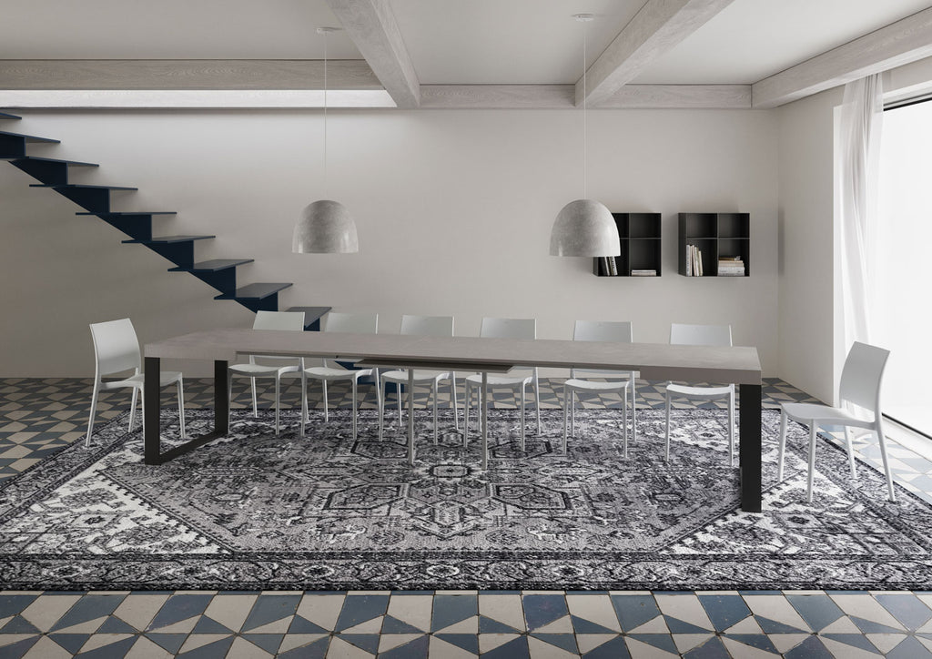 Tavolo allungabile Tecno da 120 cm, dal design lineare, semplice ed essenziale, si adatta a qualsiasi stile di arredamento e si rivela la scelta ideale sia come tavolo da pranzo che come elemento d'arredo per il soggiorno, dove poter accogliere i propri ospiti con stile. Il tavolo allungabile Tecno è in grado di estendersi progressivamente fino a 380 cm capace di ospitare 16 persone. Realizzato con pannelli in nobilitato, gambe in ferro, piano con lavorazione a Folding. Il sistema di estensione con guide telescopiche in alluminio rende il tavolo stabile e robusto anche se totalmente allungato, senza bisogno di ulteriori sostegni. Due allunghe sono alloggiate sotto il piano pronte all'utilizzo mentre le rimanenti tre vanno riposte altrove.