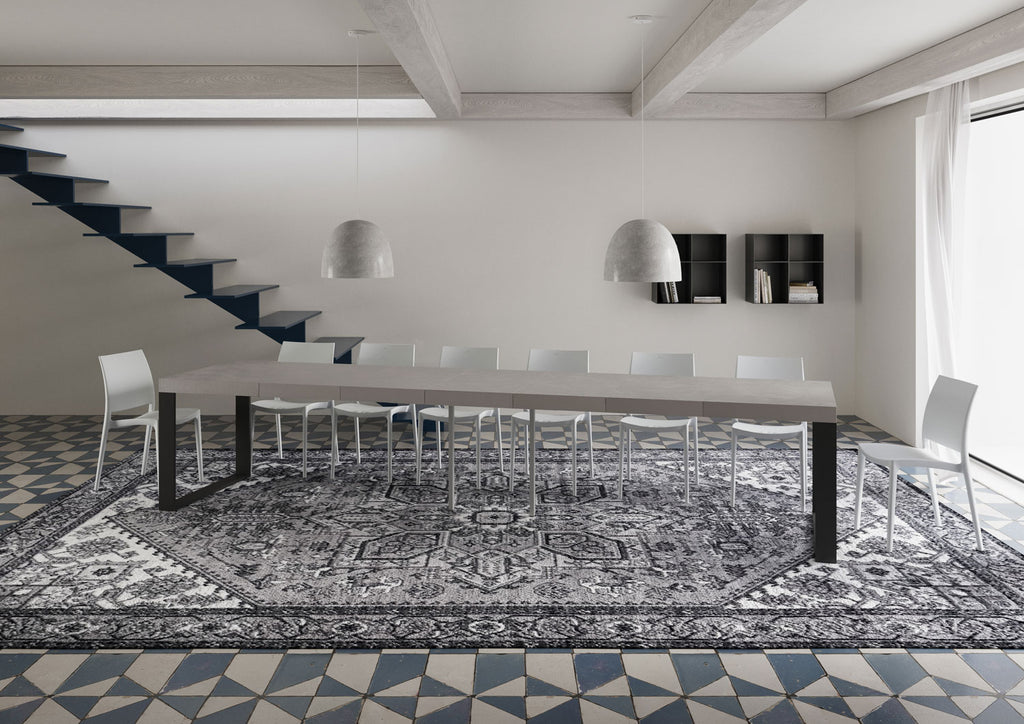 Tavolo allungabile Tecno Premium da 120 cm, dal design lineare, semplice ed essenziale, si adatta a qualsiasi stile di arredamento e si rivela la scelta ideale sia come tavolo da pranzo che come elemento d'arredo per il soggiorno, dove poter accogliere i propri ospiti con stile. Il tavolo allungabile Tecno Premium è in grado di estendersi progressivamente fino a 380 cm capace di ospitare 16 persone. Realizzato con pannelli in nobilitato, gambe in ferro, piano e allunghe con lavorazione a Folding. Il sistema di estensione con guide telescopiche in alluminio rende il tavolo stabile e robusto anche se totalmente allungato, senza bisogno di ulteriori sostegni. Quando non utilizzate, le allunghe non trovano collocamento all’interno della struttura del tavolo e vanno quindi riposte altrove.