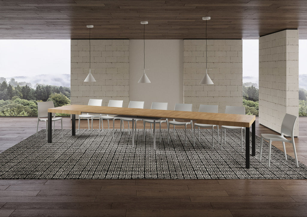 Tavolo allungabile Everyday da 140 cm, dal design lineare, semplice ed essenziale, si adatta a qualsiasi stile di arredamento e si rivela la scelta ideale sia come tavolo da pranzo che come elemento d'arredo per il soggiorno, dove poter accogliere i propri ospiti con stile. Il tavolo allungabile Everyday è in grado di estendersi progressivamente fino a 400 cm capace di ospitare 18 persone. Realizzato con pannelli in nobilitato, gambe in ferro, piano con lavorazione a Folding. Il sistema di estensione con guide telescopiche in alluminio rende il tavolo stabile e robusto anche se totalmente allungato, senza bisogno di ulteriori sostegni. Due allunghe sono alloggiate sotto il piano pronte all'utilizzo mentre le rimanenti tre vanno riposte altrove.