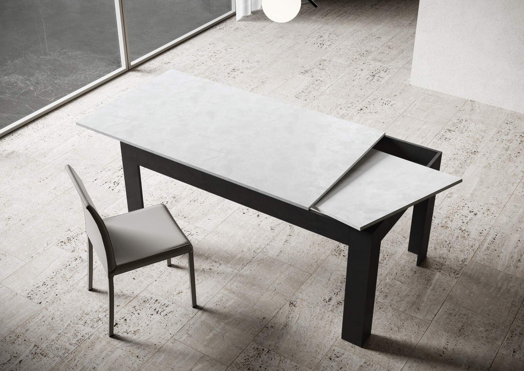 Tavolo Bibi Mix 160 allungabile a 220, una novità di carattere e personalizzabile per quanto riguarda il tavolo allungabile Bibi, da ora proposto nella versione con piano e base in diverse finiture, a creare un piacevole contrasto visivo in grado di esaltare e apportare personalità a qualunque spazio o ambiente. Una soluzione moderna per arredare con gusto e stile un soggiorno, una sala da pranzo o cucina. Il tavolo è dotato di una allunga da 60 cm che ne permette l'estensione fino a 220 cm di lunghezza, trasformandosi così in un capiente tavolo da pranzo in grado di ospitare fino a 10 persone. Perfetto sia per un utilizzo quotidiano che per quando più ospiti sono attesi. Il meccanismo di apertura ed estensione del tavolo è estremamente semplice: è sufficiente far scorrere il piano del tavolo sulle guide del telaio per creare così lo spazio sufficiente per l'inserimento laterale dell'allunga. Quando non utilizzata, l'allunga può essere riposta al di sotto del piano, in modo da non creare ingombro. Made in Italy con materiali 100% italiani.