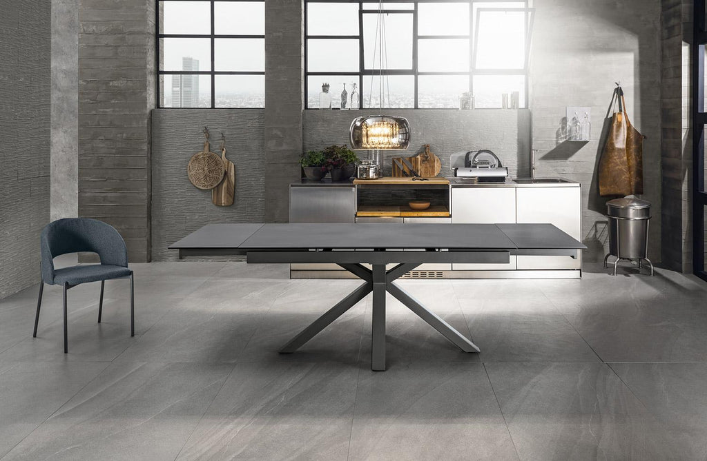 Ausziehbarer Tisch mit Keramikplatte auf gehärtetem Glas, industrieller Stil, vielseitig und funktioniert immer auch mit der Kombination anderer Möbeltypen.