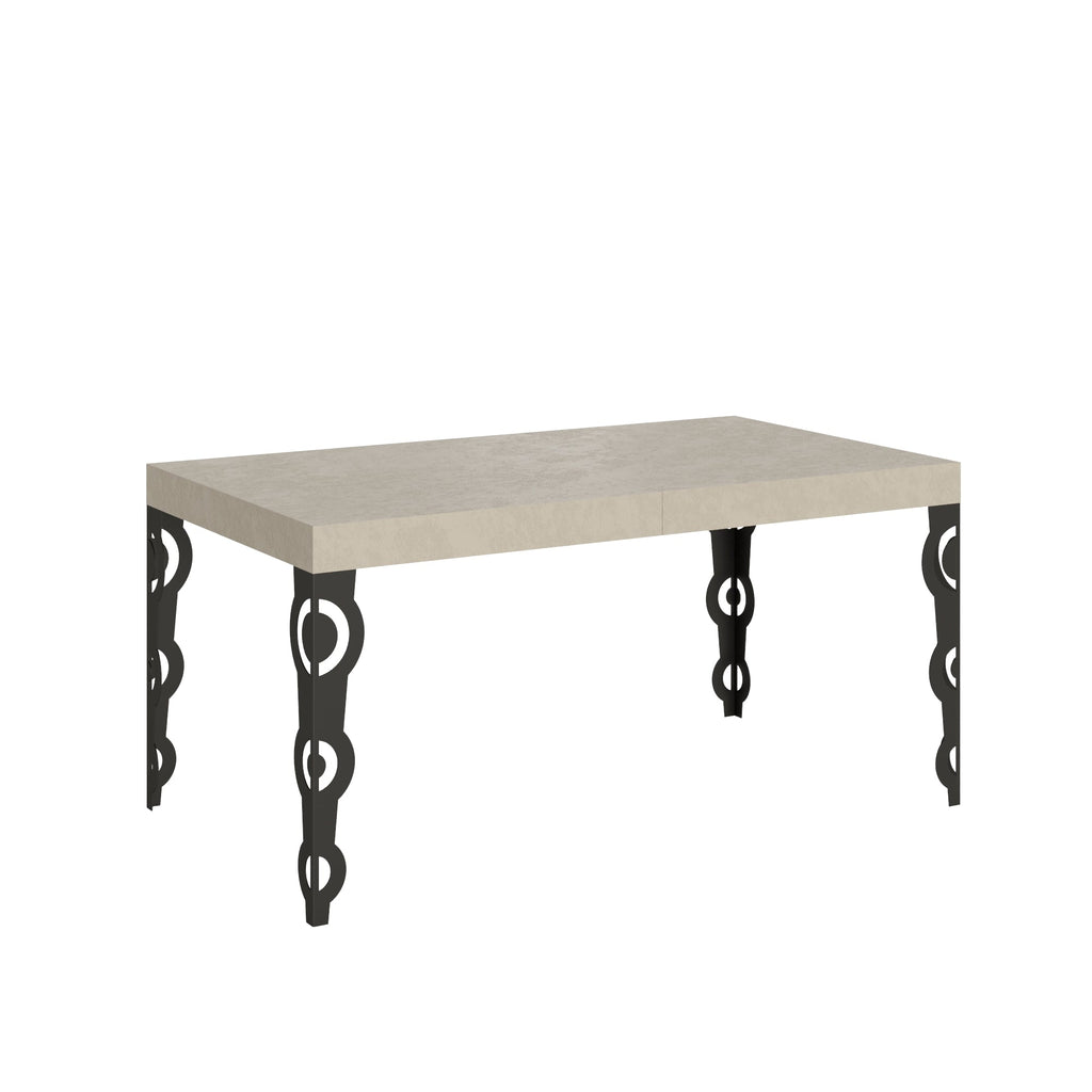 Tavolo allungabile Karamay da 160 cm, dal design moderno dallo stile ricercato e stravagante, si adatta a qualsiasi stile di arredamento e si rivela la scelta ideale sia come tavolo da pranzo che come elemento d'arredo per il soggiorno, dove poter accogliere i propri ospiti con stile. Il tavolo allungabile Karamay è in grado di estendersi progressivamente fino a 264 cm capace di ospitare 12 persone. Realizzato con pannelli in nobilitato, gambe in ferro, piano con lavorazione a Folding. Il sistema di estensione con guide telescopiche in alluminio rende il tavolo stabile e robusto anche se totalmente allungato, senza bisogno di ulteriori sostegni. Le allunghe sono immediatamente pronte all'utilizzo in quanto alloggiate sotto il piano principale.