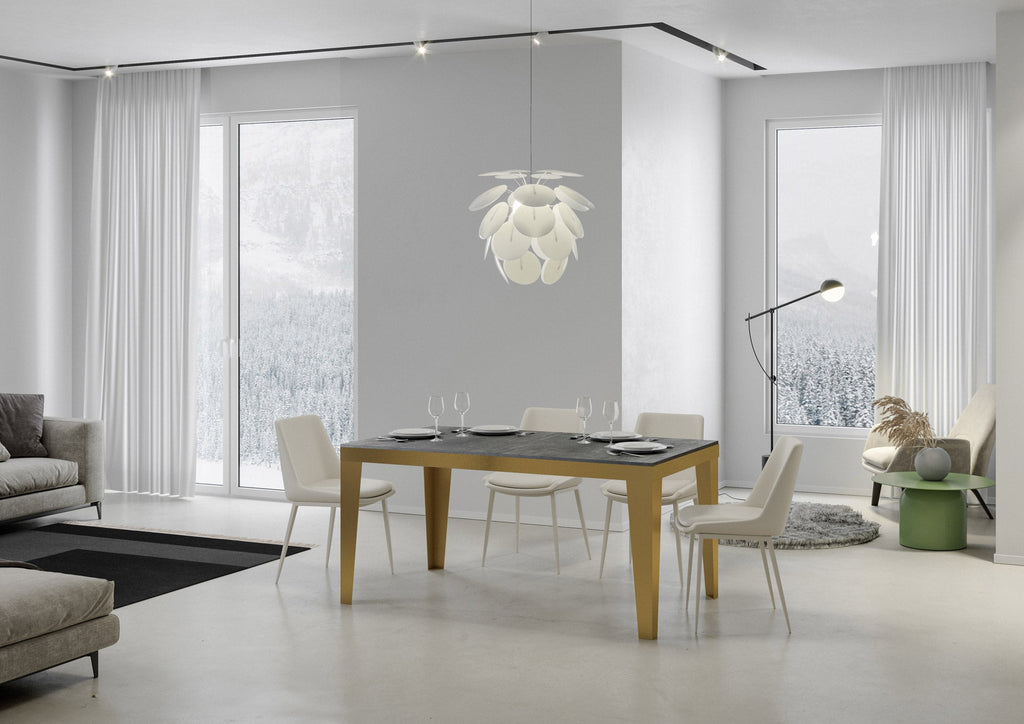 Il Tavolo Flame Evolution 160 Allungabile è una linea dallo stile stravagante e raffinato, grazie alle particolari decorazioni delle gambe. Le gambe e il telaio sottopiano in ferro verniciato è in grado di garantire solidità alla struttura, anche quando completamente esteso. Si adatta ad ogni esigenza di spazio, grazie al particolare sistema di allunghe che gli permette di estendersi fino a 264 cm. Le allunghe presentano la stessa finitura del piano sono alloggiate sotto al piano. Made in Italy con materiali 100% italiani.