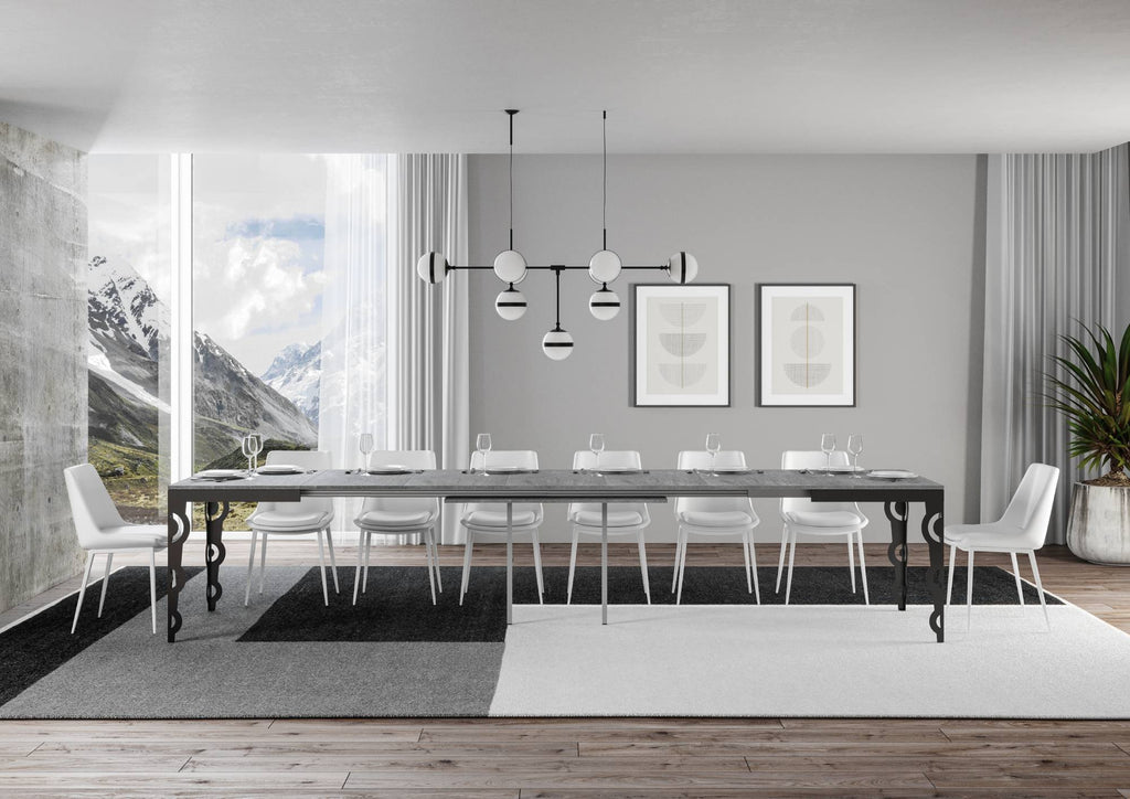 Il Tavolo Karamay Evolution 160 Allungabile fino a 420 cm è una linea dallo stile stravagante e raffinato, grazie alle particolari decorazioni delle gambe. Le gambe e il telaio sottopiano in ferro verniciato è in grado di garantire solidità alla struttura, anche quando completamente esteso. Si adatta ad ogni esigenza di spazio, grazie al particolare sistema di allunghe che gli permette di estendersi fino a 420 cm. Il Tavolo Karamay Evolution ha due allunghe alloggiate sotto il piano, pronte all'utilizzo, le altre tre sono da riporre in altro luogo quando non utilizzate. Made in Italy con materiali 100% italiani.