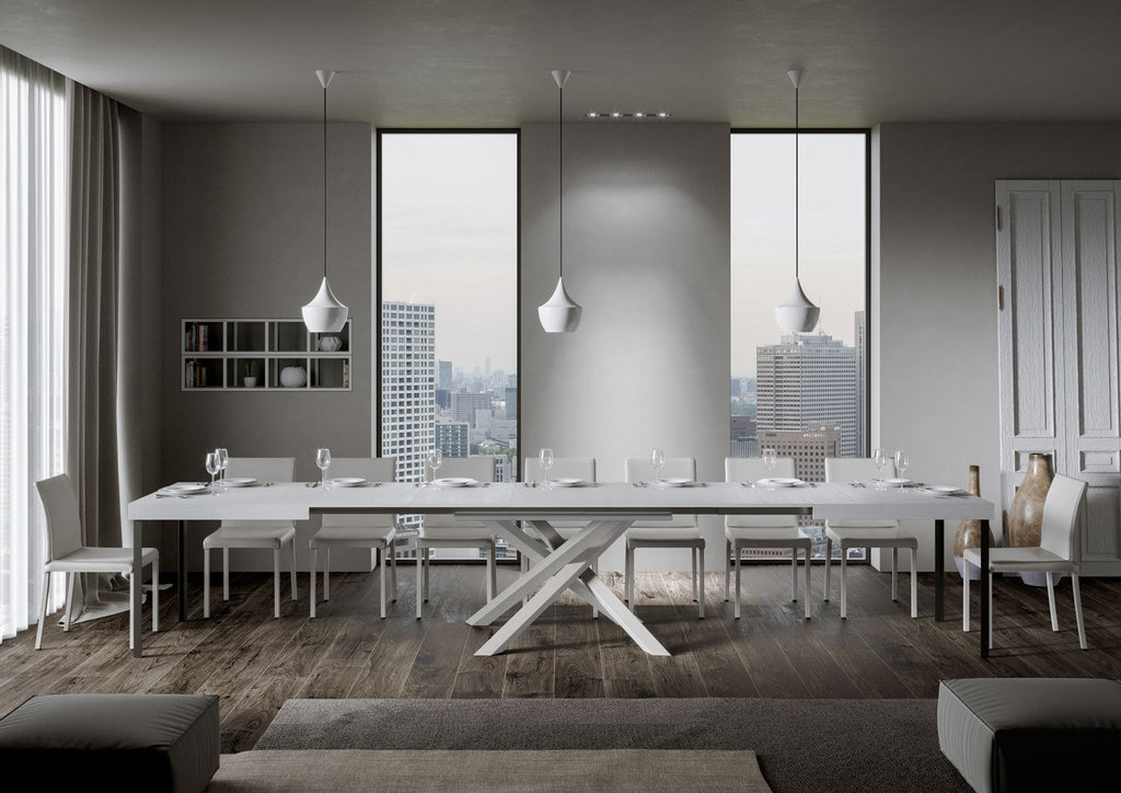 Tavolo allungabile Volantis da 160 cm, dal design moderno dallo stile sofisticato, si adatta a qualsiasi stile di arredamento e si rivela la scelta ideale sia come tavolo da pranzo che come elemento d'arredo per il soggiorno, dove poter accogliere i propri ospiti con stile. Il tavolo allungabile Volantis è in grado di estendersi progressivamente fino a 420 cm capace di ospitare 18 persone. Realizzato con pannelli in nobilitato, gambe in ferro, piano con lavorazione a Folding. Il sistema di estensione con guide telescopiche in alluminio e i sostegni laterali in dotazione rendono il tavolo stabile e robusto anche se totalmente allungato. Due allunghe sono alloggiate sotto il piano pronte all'utilizzo mentre le rimanenti tre vanno riposte altrove.