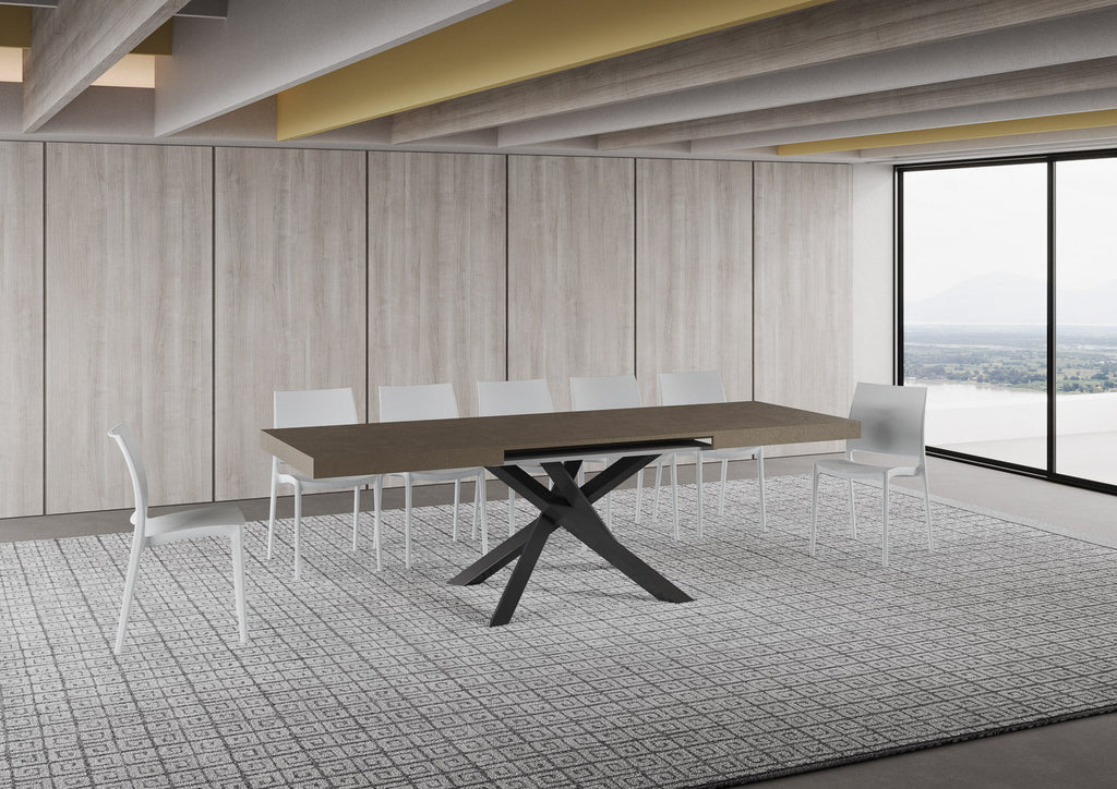 Tavolo allungabile Volantis da 160 cm, dal design moderno dallo stile sofisticato, si adatta a qualsiasi stile di arredamento e si rivela la scelta ideale sia come tavolo da pranzo che come elemento d'arredo per il soggiorno, dove poter accogliere i propri ospiti con stile. Il tavolo allungabile Volantis è in grado di estendersi progressivamente fino a 420 cm capace di ospitare 18 persone. Realizzato con pannelli in nobilitato, gambe in ferro, piano con lavorazione a Folding. Il sistema di estensione con guide telescopiche in alluminio e i sostegni laterali in dotazione rendono il tavolo stabile e robusto anche se totalmente allungato. Due allunghe sono alloggiate sotto il piano pronte all'utilizzo mentre le rimanenti tre vanno riposte altrove.