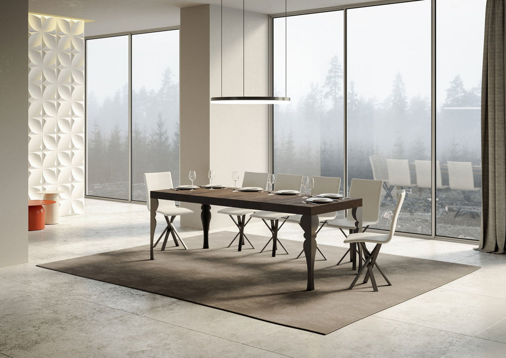 Tavolo allungabile Paxon Premium da 180 cm, dal design moderno dallo stile ricercato e stravagante, si adatta a qualsiasi stile di arredamento e si rivela la scelta ideale sia come tavolo da pranzo che come elemento d'arredo per il soggiorno, dove poter accogliere i propri ospiti con stile. Il tavolo allungabile Paxon Premium è in grado di estendersi progressivamente fino a 440 cm capace di ospitare 18 persone. Realizzato con pannelli in nobilitato, gambe in ferro, piano e allunghe con lavorazione a Folding. Il sistema di estensione con guide telescopiche in alluminio rende il tavolo stabile e robusto anche se totalmente allungato, senza bisogno di ulteriori sostegni. Quando non utilizzate, le allunghe non trovano collocamento all’interno della struttura del tavolo e vanno quindi riposte altrove.