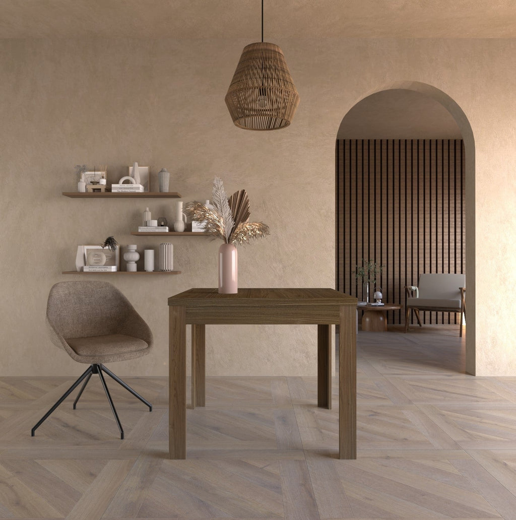 Questo tavolo compatto è perfetto per piccoli spazi come cucine o angoli pranzo. Con dimensioni iniziali di 90x90cm, può essere allungato fino a 180cm per ospitare più ospiti quando necessario. Il design versatile e moderno si adatta bene a vari stili di arredamento, e il piano in melaminico è resistente e facile da pulire.