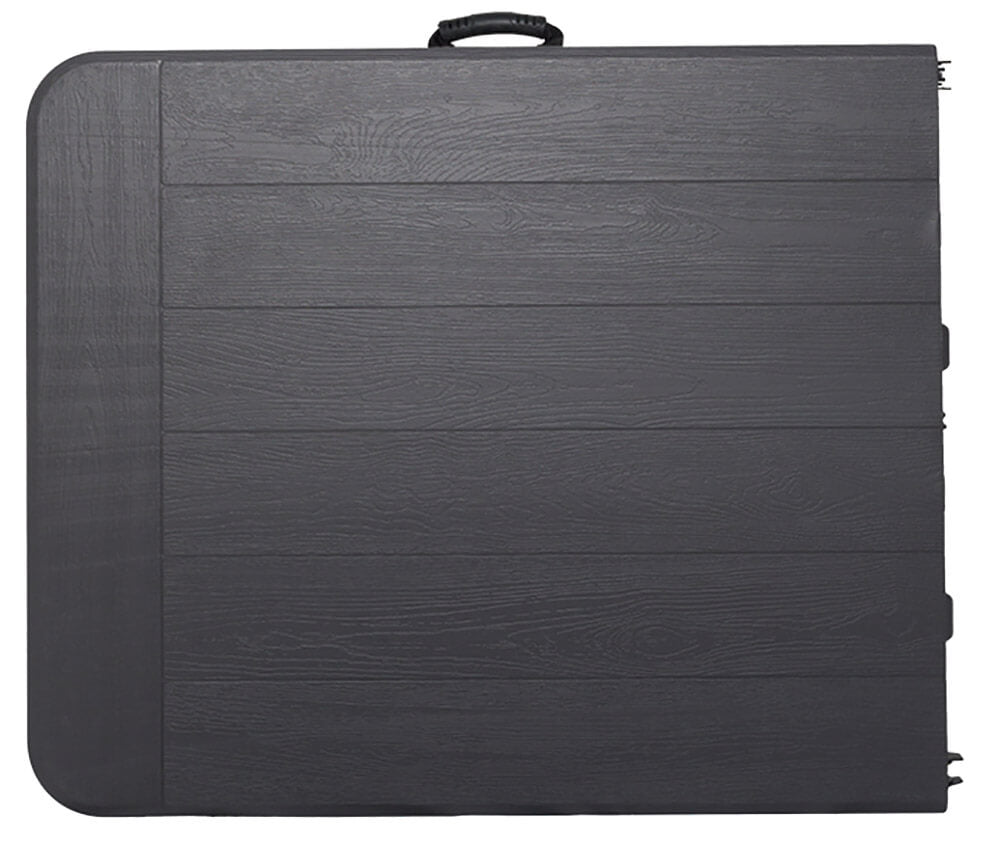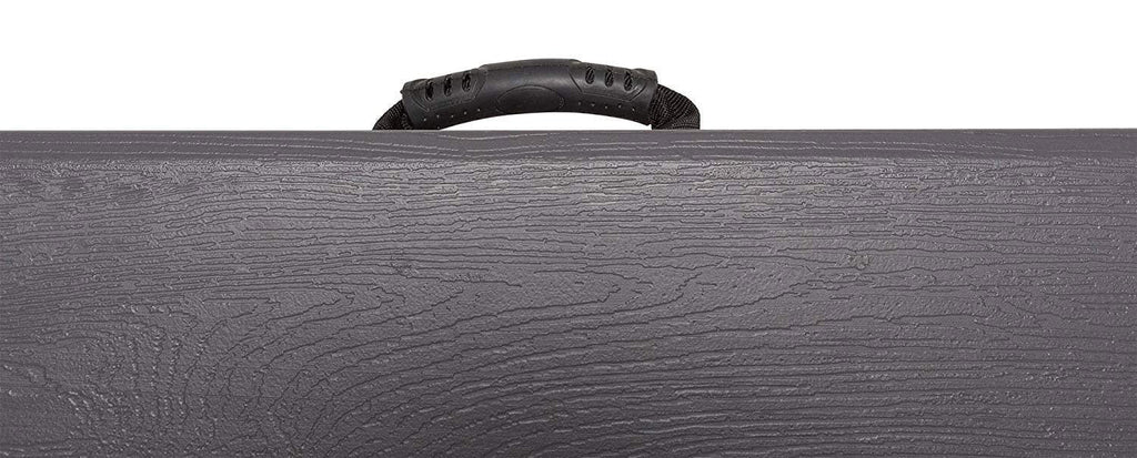 Der Tisch besteht aus 6 Leisten mit Intarsien, die die Maserung des Holzes wiedergeben und lässt sich in einer praktischen Tragetasche mit Griff verschließen.