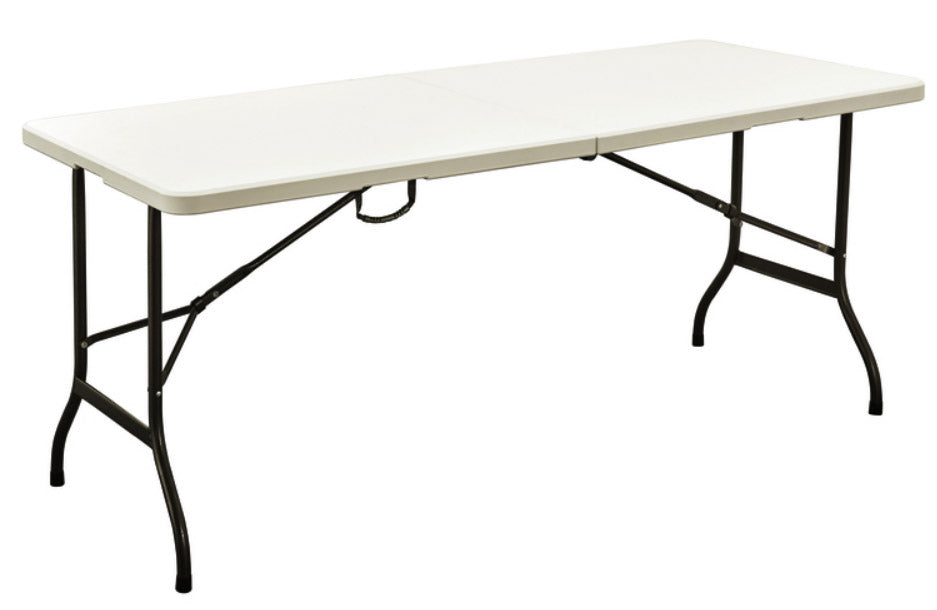 Faltbarer weißer Catering-Tisch aus hochdichtem HDPE-Propylen, praktisch und sofort einsatzbereit. Geeignet für den Innen- und Außenbereich. Platzsparender Tisch, die Beine schließen sich, um wenig Platz einzunehmen, wenn er verstaut werden muss, er wird zu einem praktischen Koffer mit Griff, um ihn ohne großen Aufwand zu tragen.
