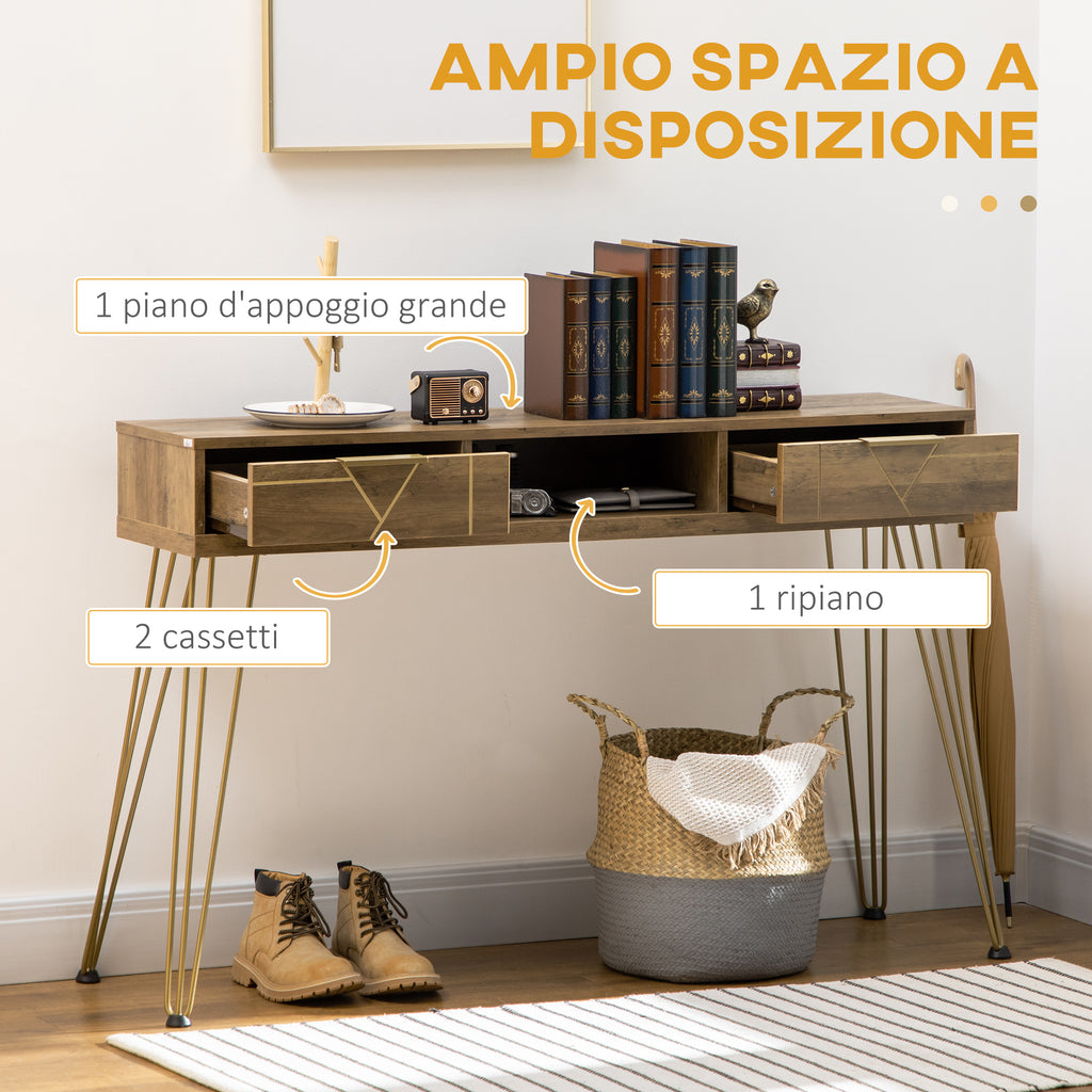 Sfrutta al meglio lo spazio con una soluzione moderna come questo tavolo consolle . È presente un ampio piano d'appoggio, un ripiano aperto e 2 cassetti per riporre borse, chiavi, e altri oggetti, mentre è presente uno spazio per mostrare alcuni soprammobili. Questa consolle da ingresso è realizzata con pannelli di truciolato e gambe in acciaio, resistenti e facili da pulire, con un design antiribaltamento che aggiunge maggiore stabilità.