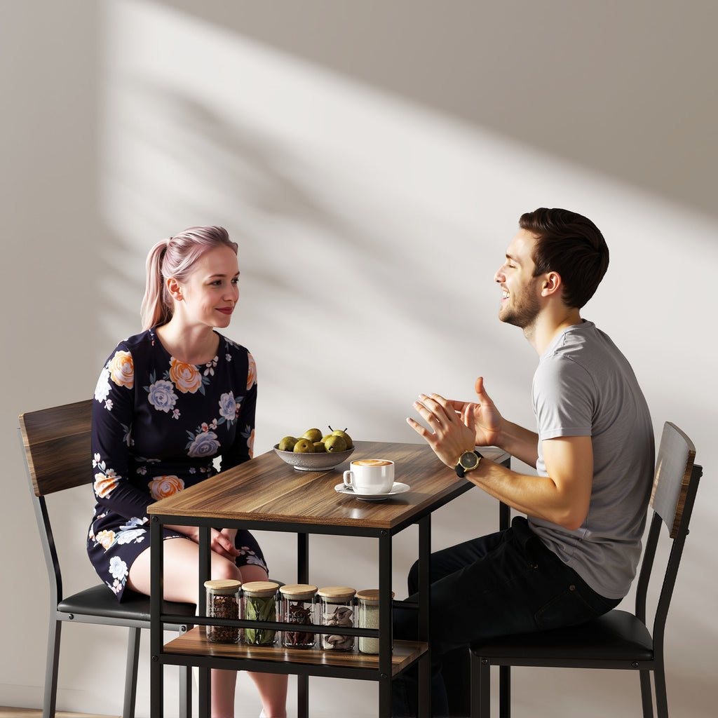 Tavolo da Bar a 3 Ripiani e 2 Sgabelli con Poggiapiedi e Schienale in Legno e Acciaio Nero e color Noce