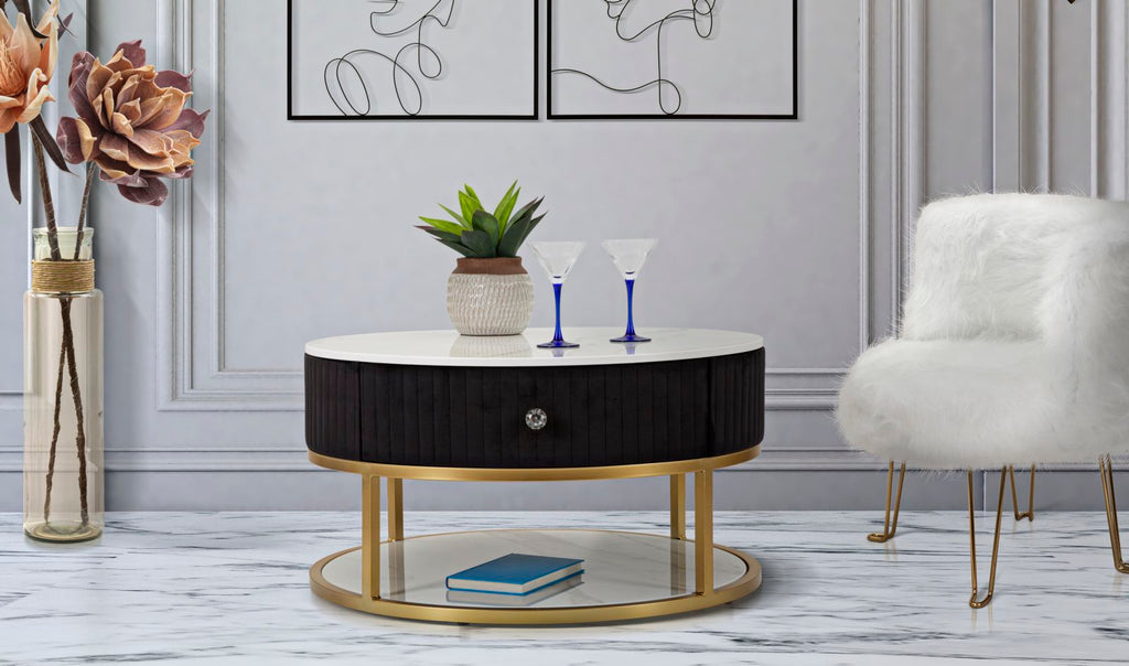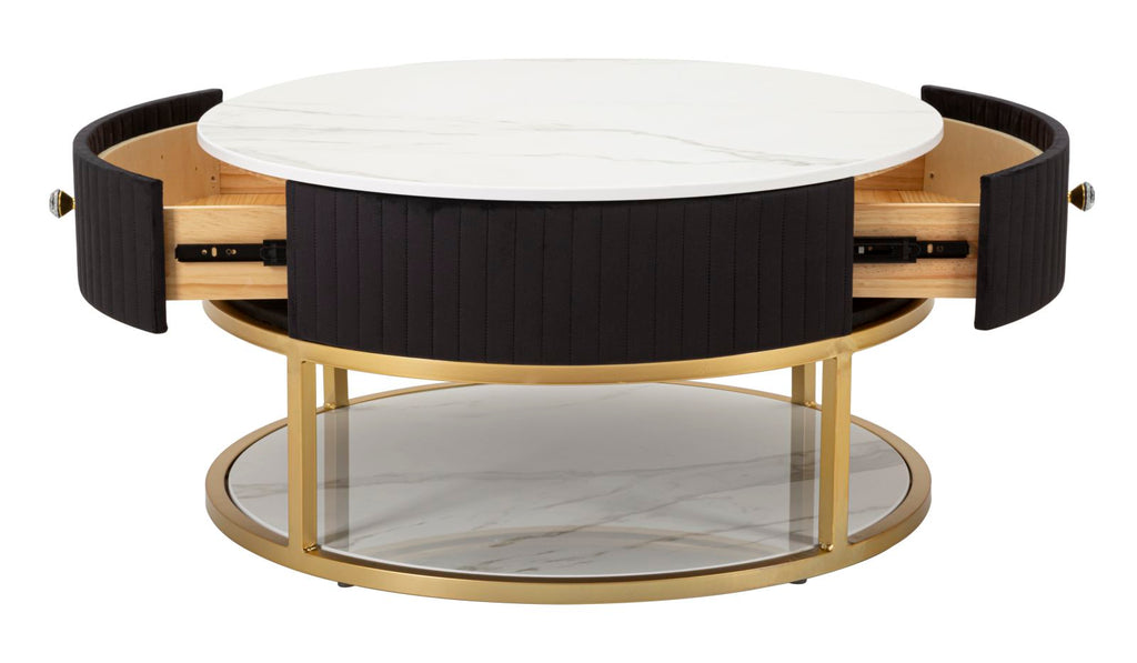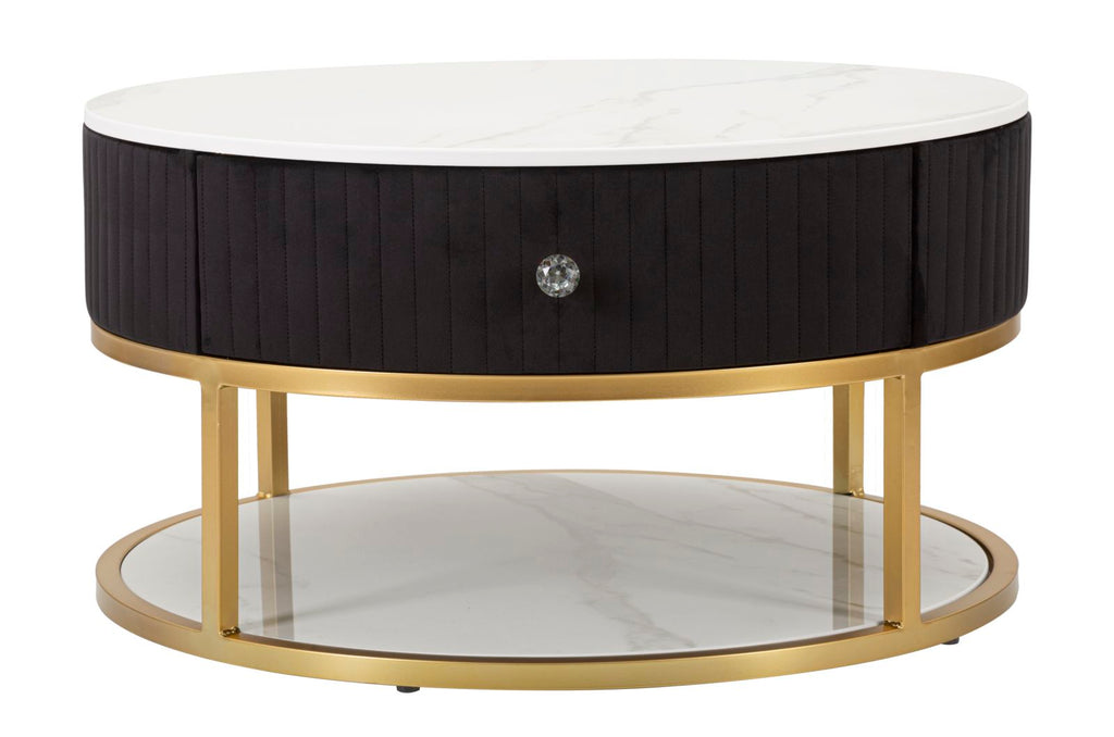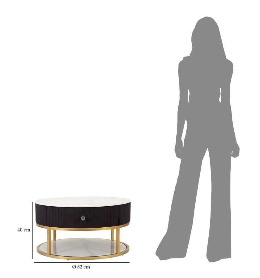 Il tavolo da caffé rotondo è caratterizzato da una raffinata struttura in metallo dorato, che conferisce eleganza e stile all'ambiente circostante. Il top e il ripiano, realizzati in simil marmo, aggiungono un tocco di lusso e classe all'arredo. Il cassetto permette invece di riporre oggetti personali in modo ordinato. Il tessuto imbottito nero che riveste la parte superiore crea un contrasto elegante e sofisticato, rendendo il tavolo adatto ad abbinarsi a qualsiasi tipologia di arredo.
