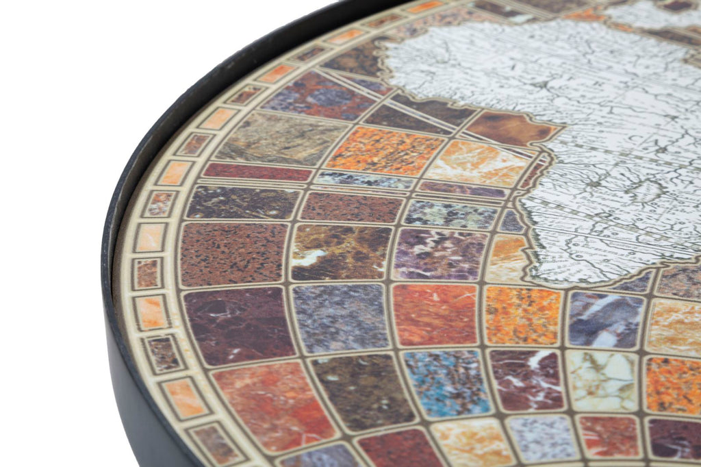Eleganter runder Tisch aus MDF mit Metallbeinen, die die Erde mit einer besonderen Mosaikverarbeitung darstellen. Eine byzantinische Note für Ihr Zuhause.