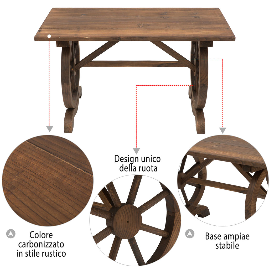 bietet Ihnen diesen originellen Gartentisch aus Tannenholz im Landhausstil zur Verschönerung Ihrer Räume. Beständig gegen Verwitterung, Verformung und Rissbildung. Sie können es als Couchtisch oder für ein Mittagessen im Freien mit Freunden verwenden. Die radförmigen Beine und das verkohlte Holz verleihen Ihrer Gartendekoration einen Hauch von Originalität. Einfach zu montieren und wird mit Montagezubehör geliefert.