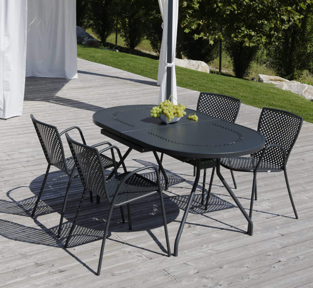 Ausziehbarer Tisch (von 160 bis 220 cm) mit vorverzinkter Stahlkonstruktion und anthrazitfarbener Polyesterfarbe.